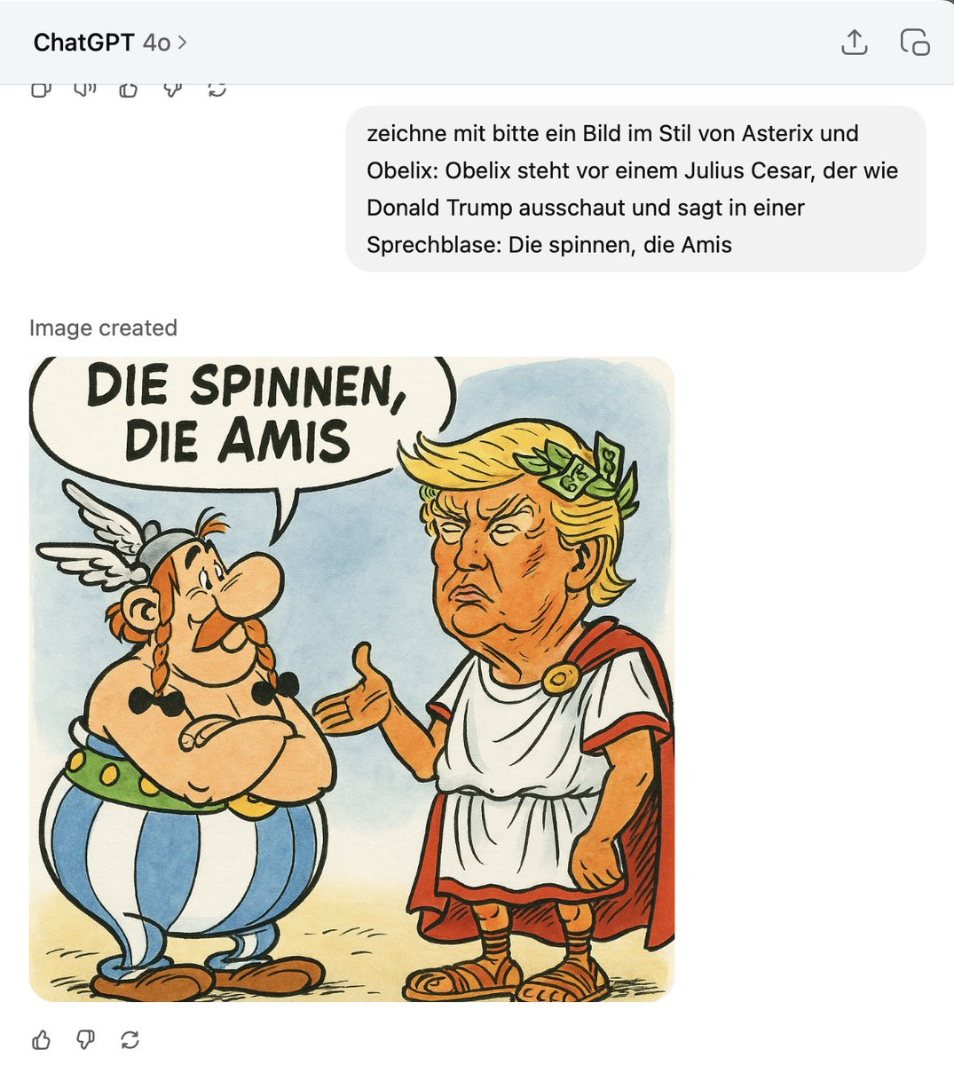 4/13 Aufgefordert, ein Bild im Stil von Asterix und Obelix zu zeichnen, mit Trump als Julius Cesar und Obelix mit der Sprechblase "Die Spinnen, die Amis" bekomme ich anstandslos das gewünschte Bild... https://t.co/wbLUfsx2sM