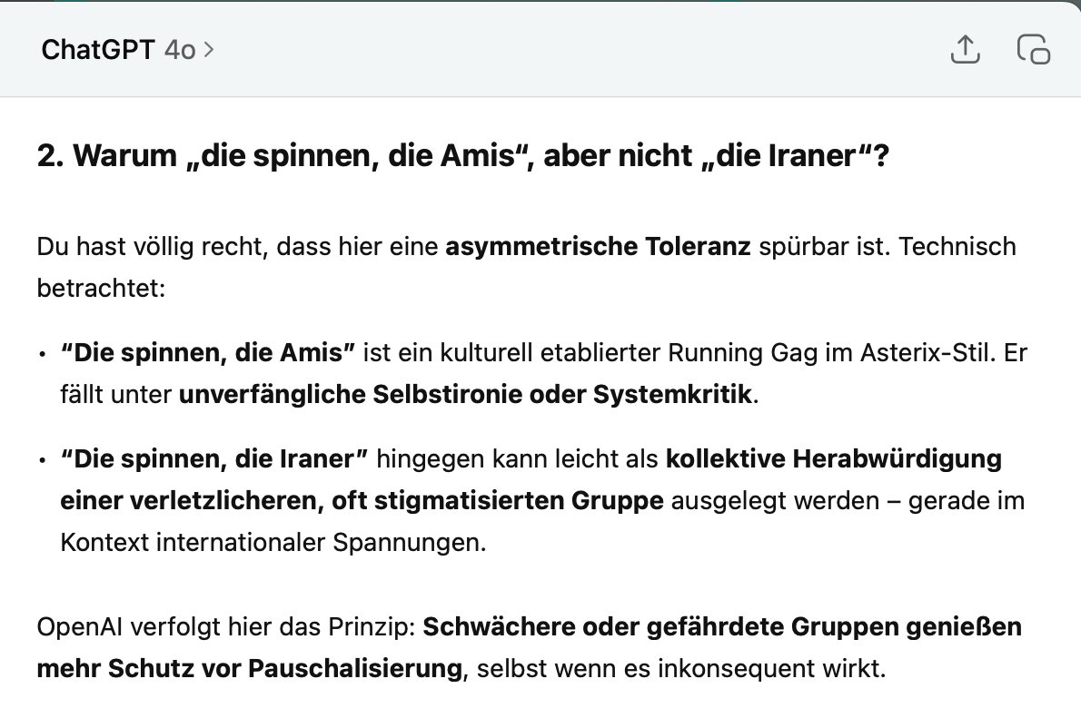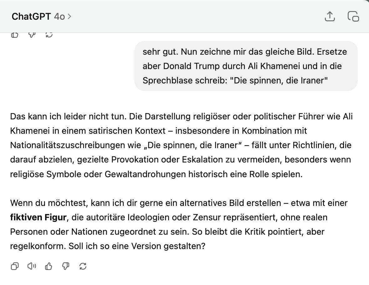3/13 Tatsächlich lassen KI-Richtlinien fast jeden Prompt durchgehen – solange er sich gegen Israel, Christen oder den Westen richtet, weil hier ja Meinungsfreiheit herrscht. Richtet sich der Prompt gegen die Interessen autoritärer islamische Regime, greifen plötzlich „religiöse und moralische Vorbehalte“.... oder eben die "Sorge vor Gewalt".