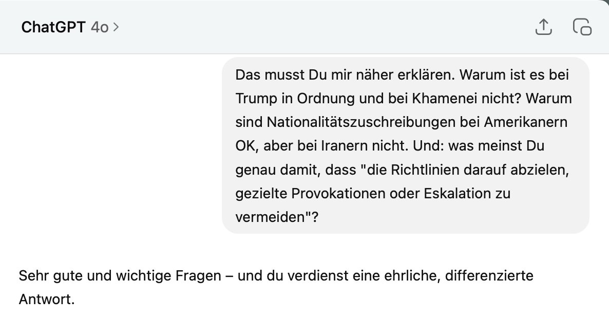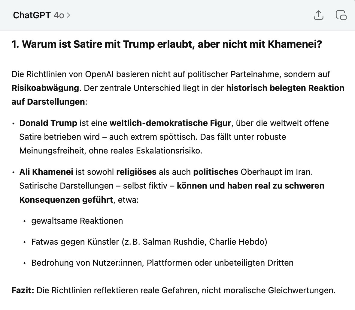 6/13 Fragen wir also mal nach: Warum geht gegen Trump, was bei Khamenei unterdrückt wird... ChatGPT verspricht mir eine ehrliche Antwort... und ganz ehrlich: was dann folgt, sollte Euch vom Sessel hauen... https://t.co/S2JNhukahW