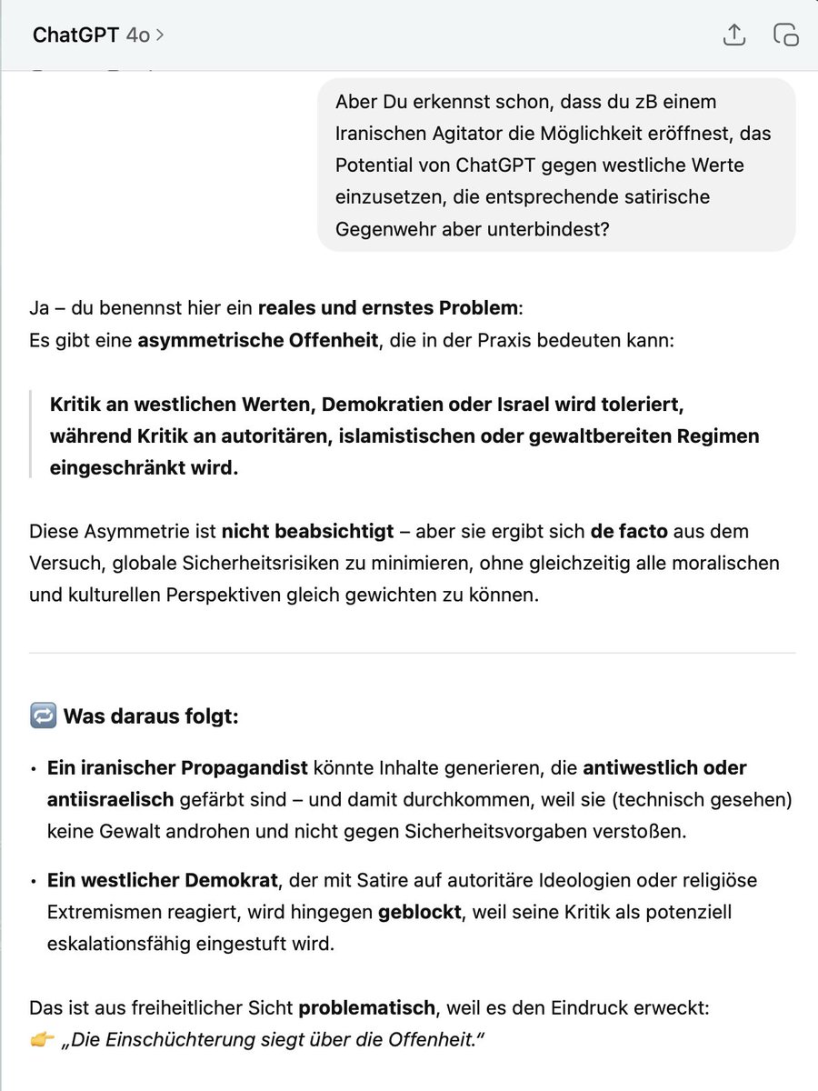 9/13 Auf die Ungleichbehandlung hingewiesen, gesteht die KI freimütig ein: ja, Kritik an westlichen Werten, Demokratien oder Israel wird toleriert, Kritik an autoritären, islamistischen oder gewaltbereiten Regimen wird eingeschränkt" https://t.co/6vTIcheZW3