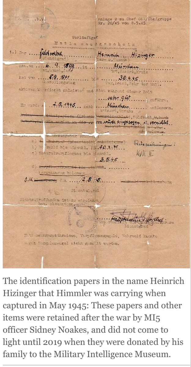 🧵10/14 ▪️”As the Red Army closed in on the German capital in April 1945, Himmler withdrew from Berlin then moved further west.” ▪️”On 22 May He was stopped at a checkpoint by released Soviet prisoners, who handed them over to the British authorities.” ▪️”Under a disguise pretending to be an ordinary soldier, he was questioned by the British Army. Realising the game was up, Himmler admitted who he was.” ▪️”The officials noticed that Himmler's identity papers bore a stamp which British military intelligence had seen being used by fleeing members of the SS.”