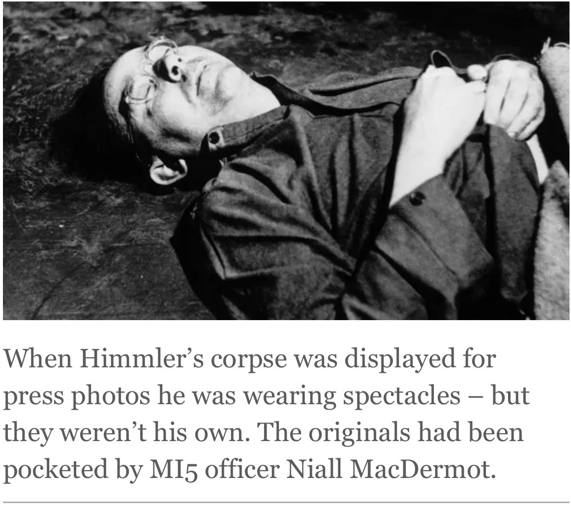 🧵12/14 Details of his death… ▪️According to statements, Himmler was searched and discovered a brass case containing a phial of what he assumed was poison, which was confiscated. Supposedly he also found a second brass case which was empty, and suspected that Himmler was concealing a second phial of poison somewhere on his person. According to the official version, no one at the second interrogation centre managed to discover this poison, and Himmler had somehow contrived to conceal it in his mouth, taking the poison when a doctor seemed about to discover it. ▪️So the official version requires us to believe that Himmler was carrying not one but two phials of poison; that he managed to conceal the second one throughout the days of his captivity, from his arrest by the Russians, through his detention camp, and on into his last hours at Murphy’s interrogation centre. We have to believe that he didn’t kill himself when captured by Russians, nor when first handed over to the British, but only when taken to a second British camp. Having chosen to identify himself and specifically asked to be taken to Montgomery, he then killed himself when getting closer to this aim (i.e. when in the custody of one of Montgomery’s senior intelligence officers).