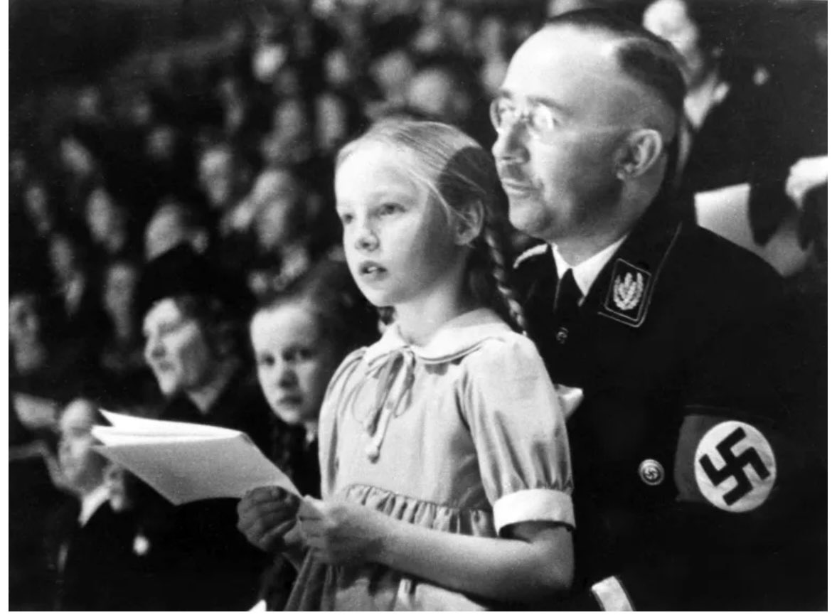 🧵13/14 My favorite part of this story…🖤 ▪️After the Allied victory, Himmler's daughter, Gudrun Burwitz she was arrested and made to testify at the Nuremberg trials. ▪️Never renouncing NSDAP beliefs, she consistently fought to defend her fathers’ reputation ▪️ She was known to be active in a group called 'Stille Hilfe,' or silent help, which was formed in the 1940s to help German fugitives/SS members flee Germany. ▪️She became a leading figure in German NSDAP movements her entire adult life until her death in 2018 at age 88. 📸 👇🏽 Heinrich Himmler with his daughter.