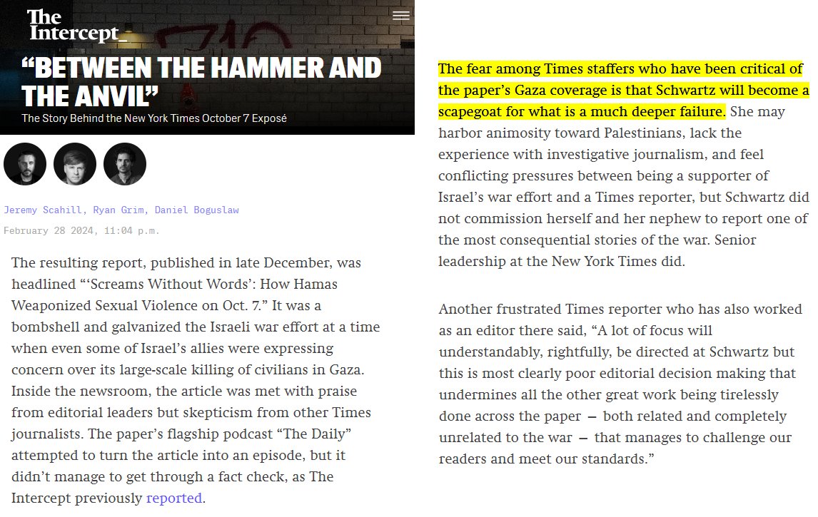 read the full Intercept report, and see how the New York Times' editors intentionally assigned Anat Schwartz, Adam Sella and Jeffrey Gettleman to fabricate a genocidal atrocity propaganda hoax which the Israeli regime is using to this very day https://theintercept.com/2024/02/28/new-york-times-anat-schwartz-october-7/