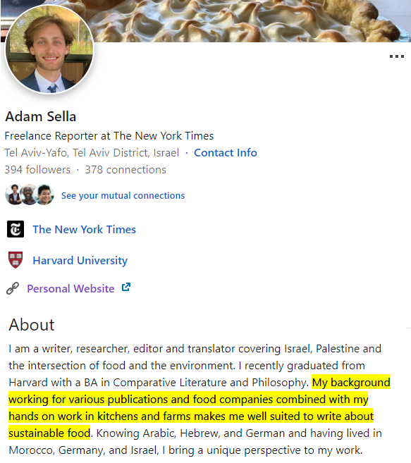 the other "on the ground reporter" who gave Gettleman all the materials for the hoax, which he then gleefully wrote up, is Adam Sella, the nephew of Schwartz' husband, a recent college grad aspiring food writer with also zero reporting experience: