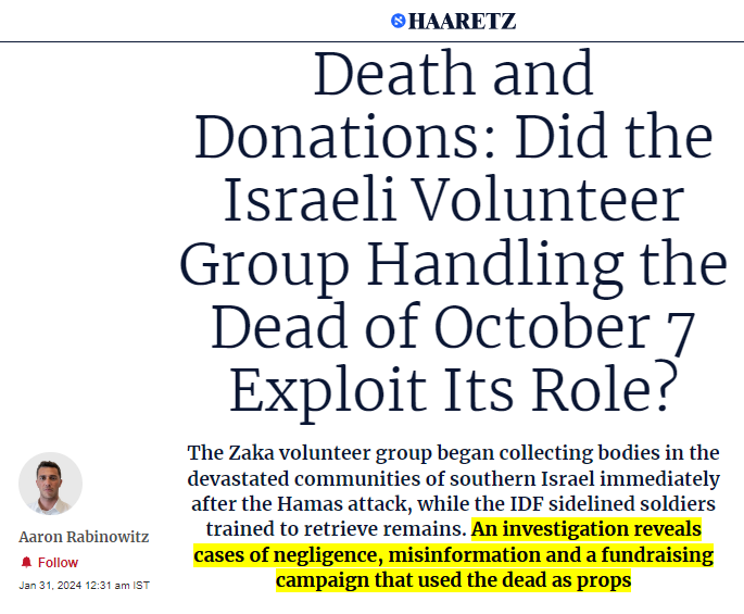 Zaka was founded by a pedophile rapist. This cult was tasked to be "first responders" on October 7 by the Israeli regime. They used that status to fabricate hoaxes, including the 40 beheaded babies. Today the AP, CNN, NYT, BBC, once again laundered their lies on their front page