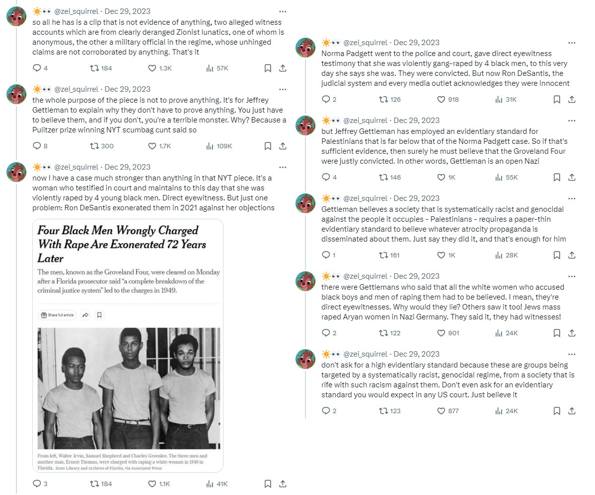 so to summarize: The entire prestige Western media class fabricated the "mass rape" hoax as genocidal atrocity propaganda on behalf of the Israeli regime to not only launder the ongoing Gaza genocide, but do cover for the actual systematic Israeli mass sexual violence and rape