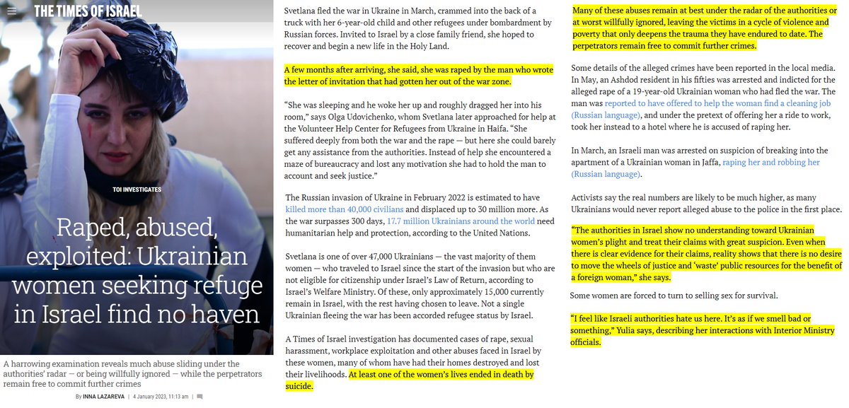 an investigation by the Times of Israel revealed that Israeli men lure Ukrainian girls and women to Israel to rape, torture and traffick them, and authorities are allowing it to happen. Victims of the rape were driven to suicide. This is the state doing "mass rape" propaganda https://t.co/rGlBK72Phn