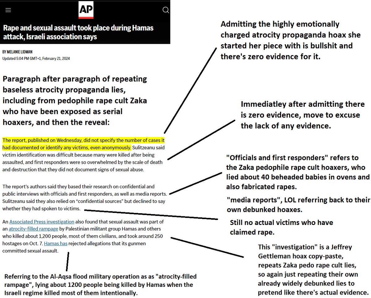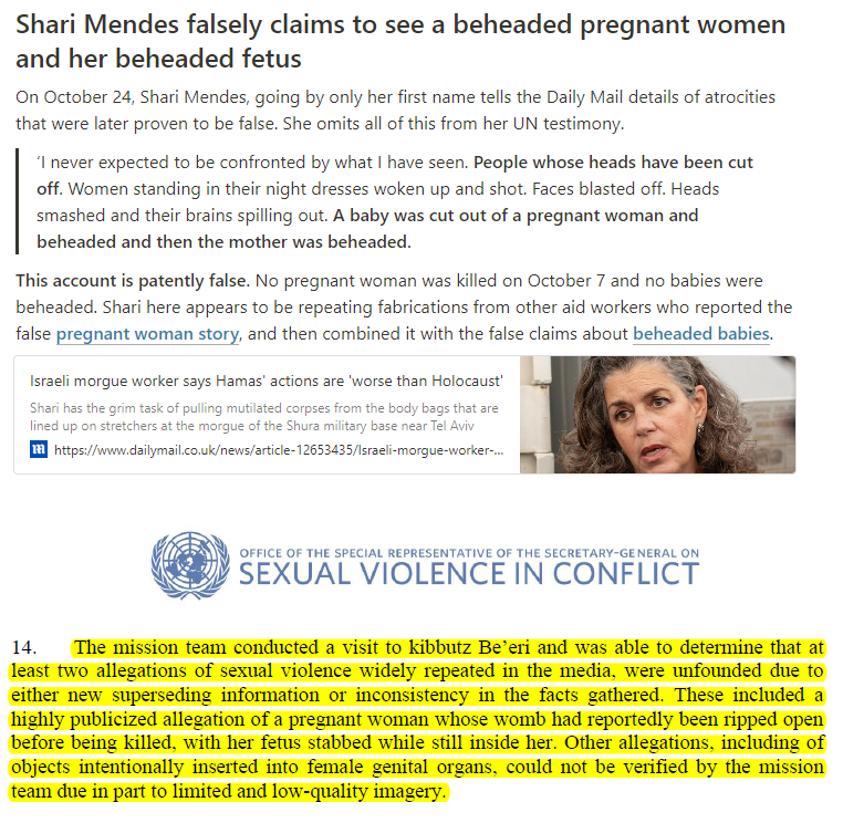 this piece by The Times is the first one I have seen in prestige Western media that accurately states both the highly limited nature, scope and content of Pramila Patten's UN report, which every other outlet keeps lying about, falsely saying it "confirms Hamas mass rape", and "found evidence of sexual violence/rape" by the evidentiary standard of an actual full legal investigation, both of which Patten herself confirms again are lies and falsehoods but the NYT, BBC, Reuters and AP keep repeating to launder their own "mass rape" hoax (see https://t.co/KLkQINAOGV and https://t.co/DXthLAiyW8). The AP just did this again recently in its report exposing the two Zaka hoaxers by constantly, over and over again, repeating these blatant lies about Patten's UN report "confirming Hamas mass rape" and "sexual violence/rape on October 7." But now the Times confirms that Patten's report was not full, legal or investigative in nature, that she explicitly does not attribute any sexual violence/rape to Hamas, and that any case of sexual violence she says might have happened on October 7 is based on a low evidentiary threshold that does not meet the standard of an actual full legal investigation, and relies entirely on Israeli information and "eyewitnesses" like the aforementioned Sapir. That is why she keeps calling for an actual investigation, which as the Times notes the Israeli regime keeps blocking. I have been saying all this for months now (see https://t.co/1LCeFrhqWE), and finally it has penetrated a mainstream prestige Western media outlet, confirming that all the others in the Western media and political class including the NYT, BBC and Guardian are blatant propagandist liars.