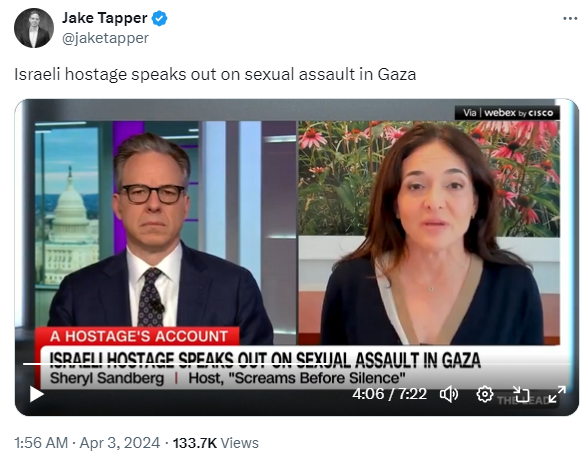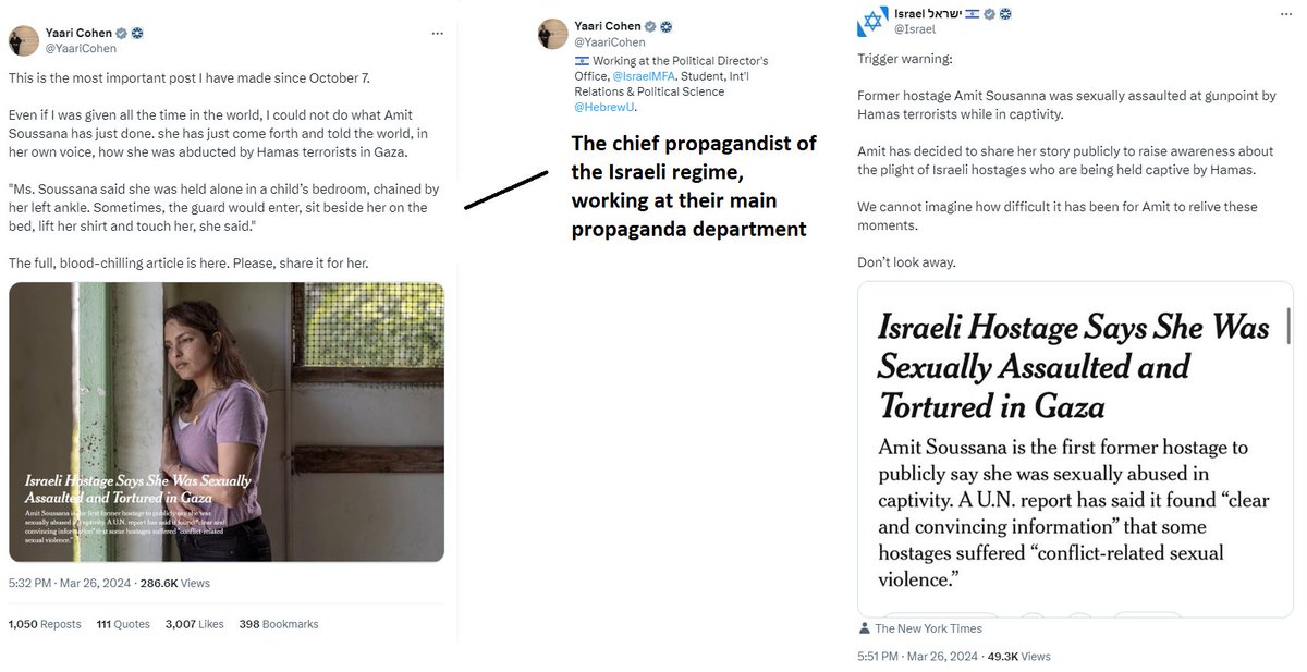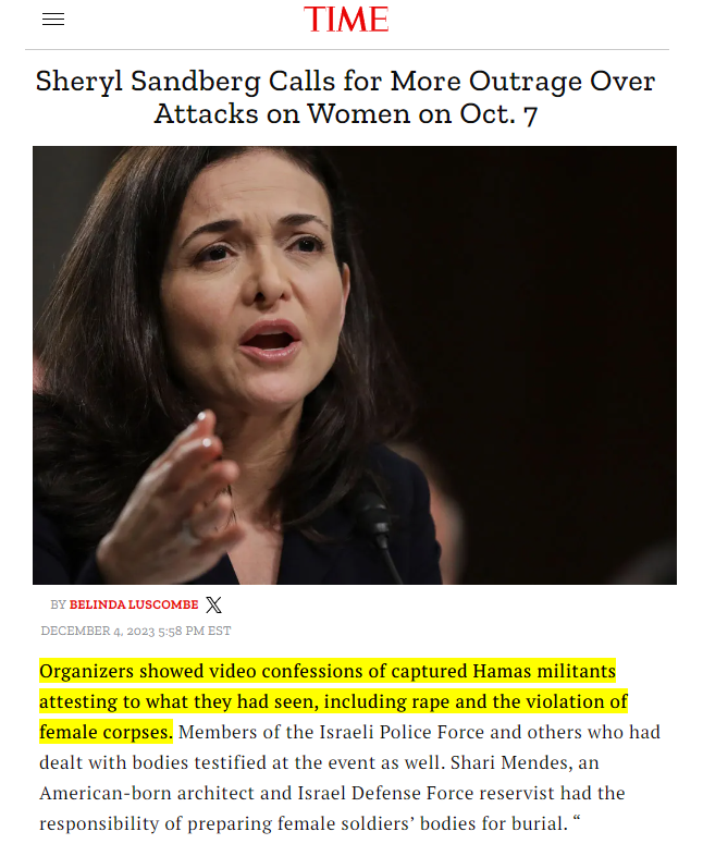 in her recent Jake Tapper media hit, the latest update in the "mass rape" hoax genocidal atrocity propaganda meant to distract from the killing of aid workers, Sandberg just straight up lies about the recent NYT Amit Soussana piece (which was of course also coordinated with her) https://t.co/s8oUfCaMGK