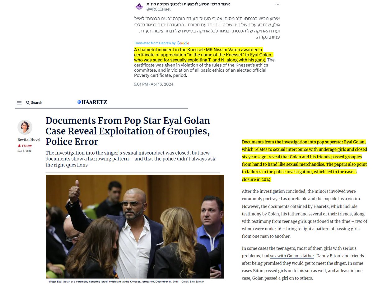 holy shit. The Israeli parliament just gave an honorary award to an Israeli Zionist musician who was arrested along with his father for gang raping and trafficking young children https://t.co/diL64S1Puc