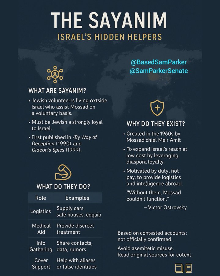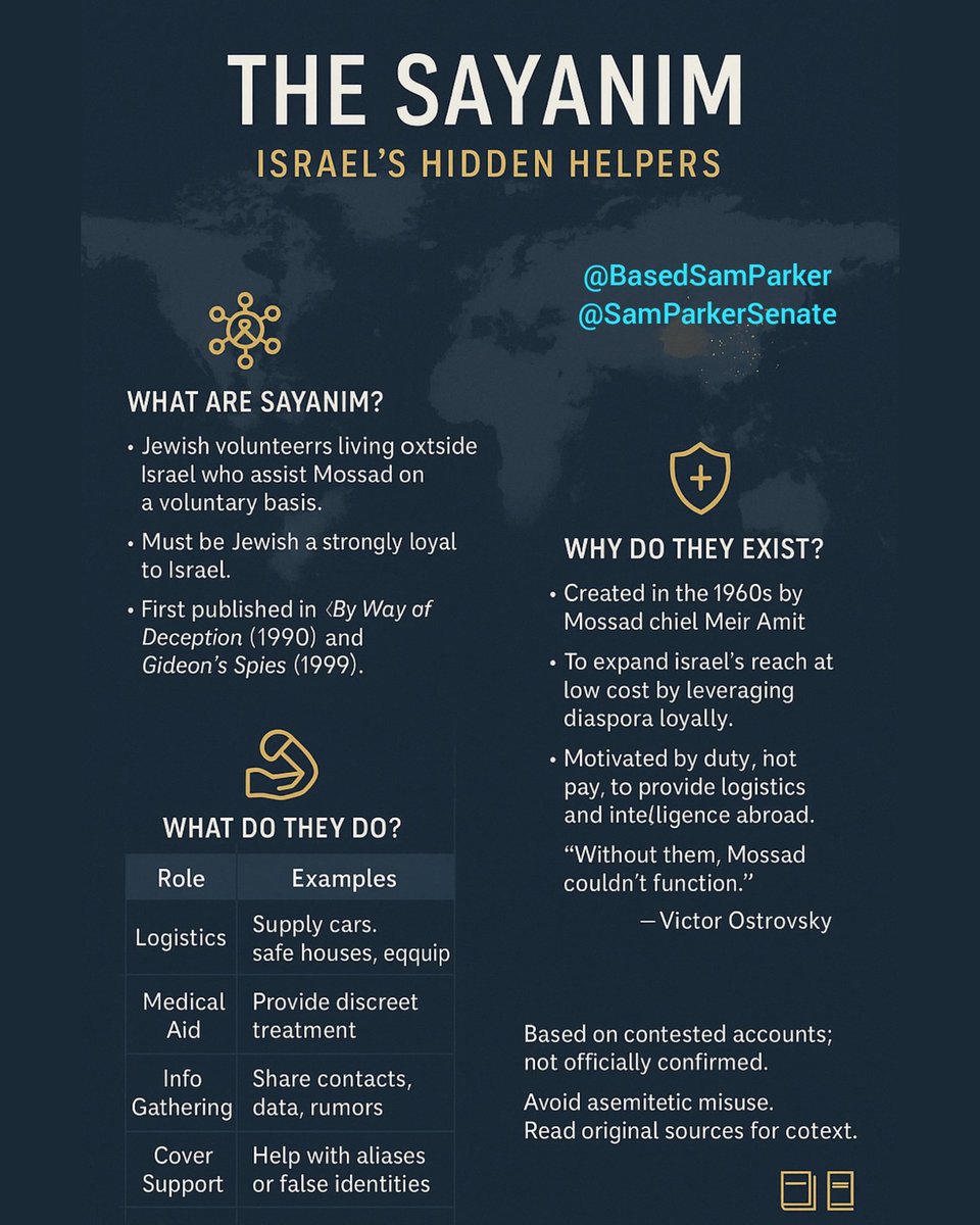 1/ Do you know about the "Sayanim"—israel's global network of civilian intelligence operatives made up of everyday, rank-and-file jewish volunteers? Without them, the Mossad couldn't function. https://t.co/uexS5JhsWK