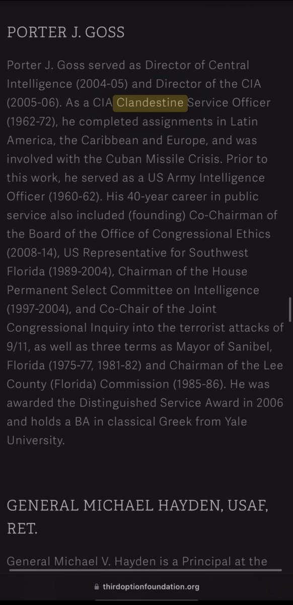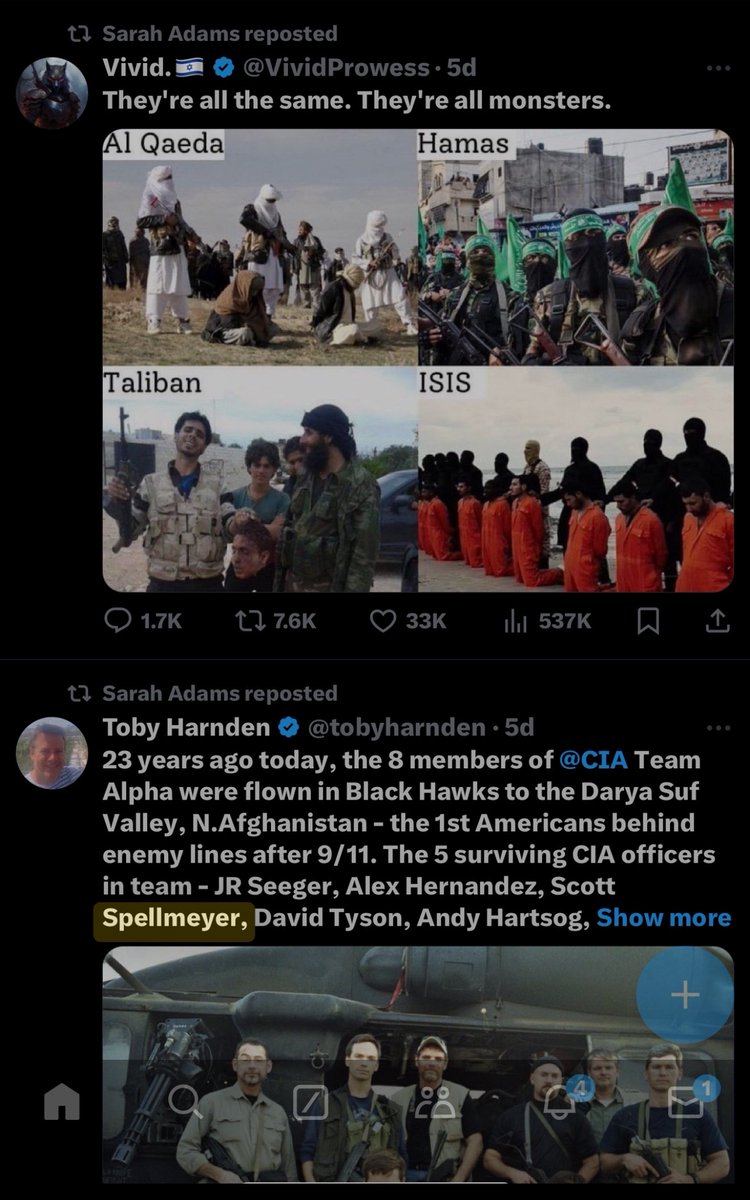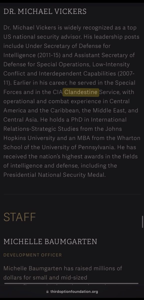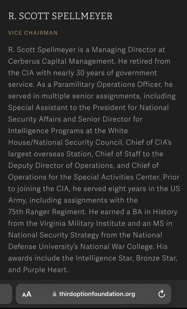 I should probably correct myself… that’s Scott Spellmeyer, who is VICE CHAIRMAN of Third Option Foundation, a MANAGING DIRECTOR of Cerberus Capital Management and Chief of Operations of the CIA Special Activities Center. Working right alongside his Third Option Foundation buddies like Porter Goss and Mossad-asset CIA traitor, Michael Vickers. Also lol at “Sara Adams reposted”.