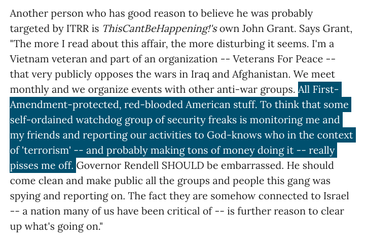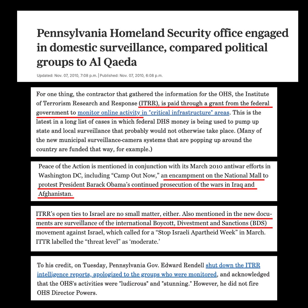 Paid with federal grants to monitor “critical infrastructure" in PA, ITRR: ➡️ Spied on anti-war activists ➡️ Recruited “citizen spies” to feed them intel Gov. Rendell called it “ludicrous” & killed the contract. But their tactics are worth looking into .. https://t.co/QMooAZiZhG