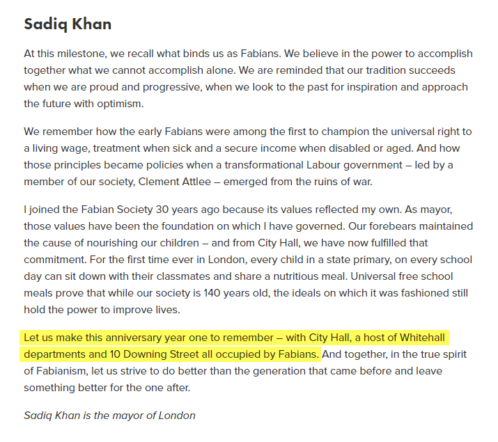 In the Spring 2024 edition of the Fabian Society's quarterly magazine, Fabian Review, Sadiq Khan wrote: "I joined the Fabian Society 30 years ago because its values reflected my own. As mayor, those values have been the foundation on which I have governed." "Let us make this [140 year] anniversary year one to remember – with City Hall, a host of Whitehall departments and 10 Downing Street all occupied by Fabians." 🧵2/7