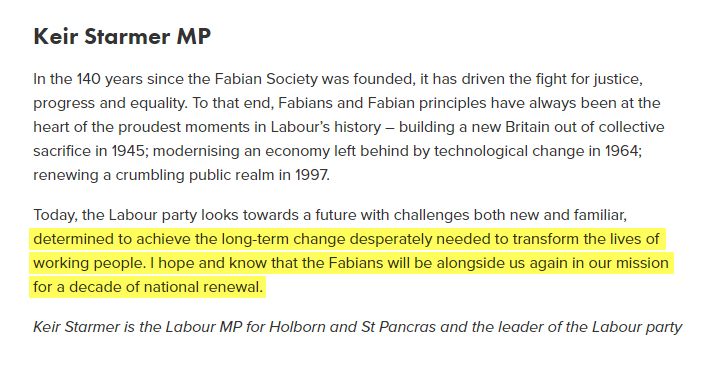 Sure enough, 10 Downing Street is now occupied by fellow Fabian and leader of the British Labour Party, Keir Starmer. Writing in the same edition of Fabian Review, Starmer boasted about the Labour Party's determination "to achieve the long-term change desperately needed to transform the lives of working people." "I hope and know that the Fabians will be alongside us again in our mission for a decade of national renewal." 🧵3/7