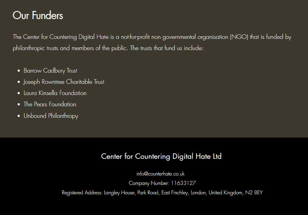 The Center for Countering Digital Hate's April 2020 archive states the organization's funding sources are: -Barrow Cadbury Trust -Joseph Rowntree Charitable Trust -Laura Kinsella Foundation -The Pears Foundation -Unbound Philanthropy @elonmusk https://web.archive.org/web/20200410095741/https://www.counterhate.co.uk/our-people