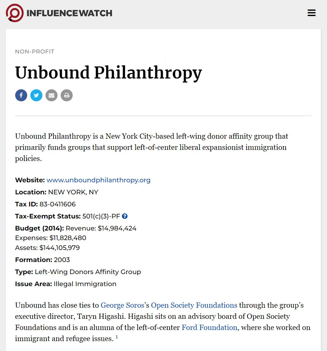 "Unbound Philanthropy is a New York City-based left-wing donor affinity group that primarily funds groups that support left-of-center liberal expansionist immigration policies. Unbound has close ties to George Soros’s Open Society Foundations through the group’s executive director, Taryn Higashi. Higashi sits on an advisory board of Open Society Foundations. Notable funders of Unbound Philanthropy include William Reeves and Deborah Berger, a married couple. Reeves is a financier who co-founded BlueCrest Capital Management, a hedge fund that manages tens of billions of dollars for clients all over the world. He sits on the board of Third Way, a left-of-center think tank with ties to the Democratic Party." https://influencewatch.org/non-profit/unbound-philanthropy/