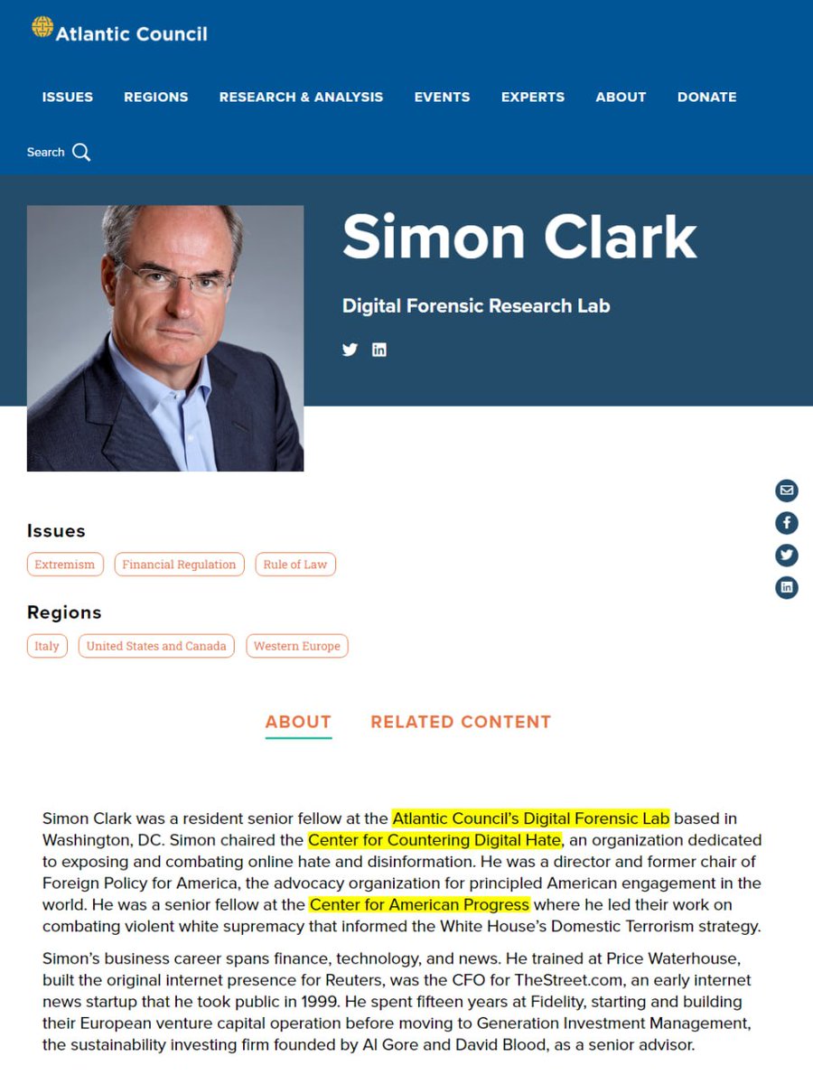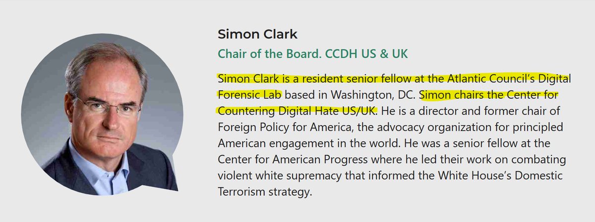 Simon Clark is the Chairman of CCDH's Board, a member of the Atlantic Council's Digital Forensic Lab, and a senior fellow at John Podesta's Center for American Progress. He is a highly partisan actor tasked with advocating for more censorship.