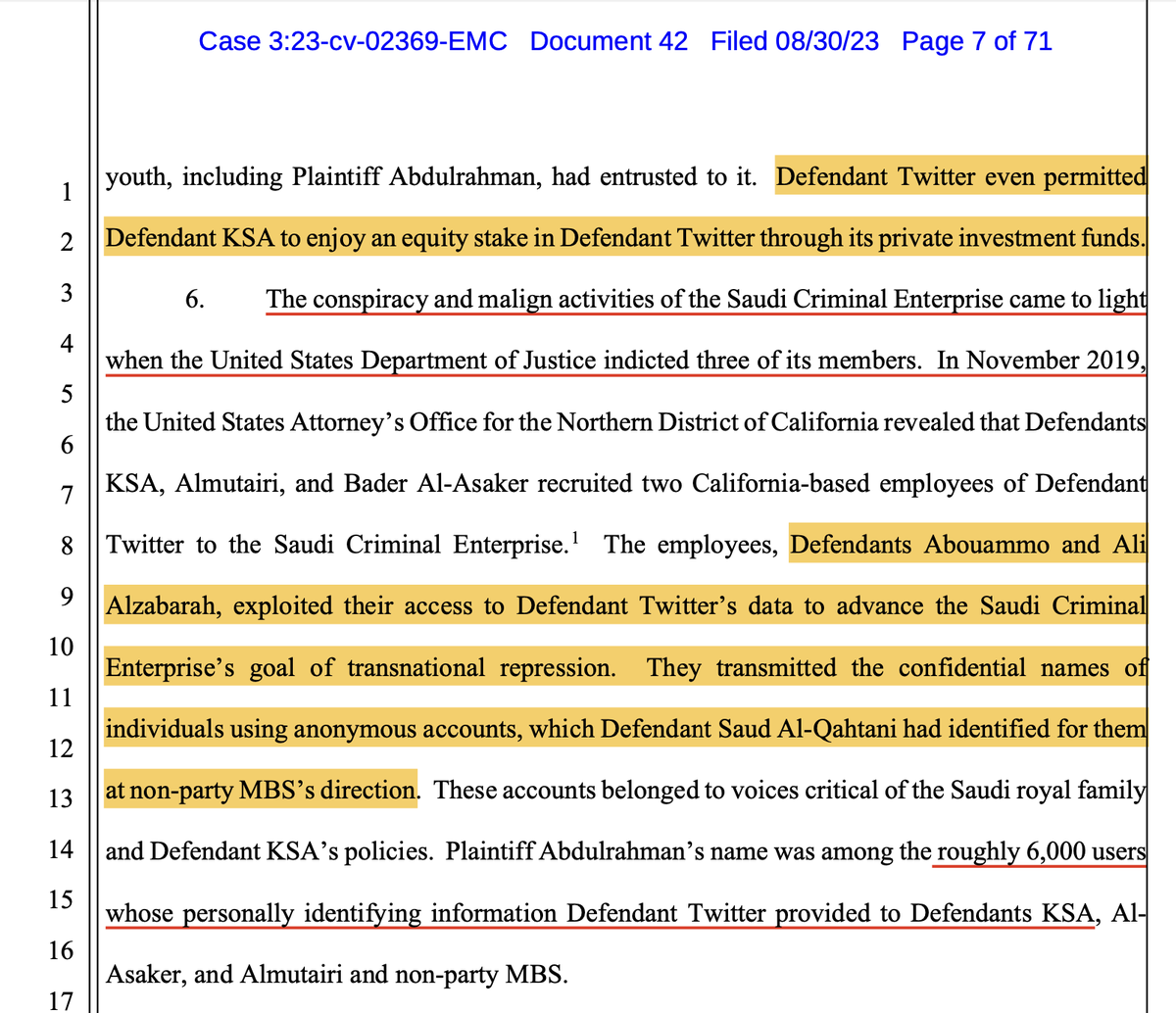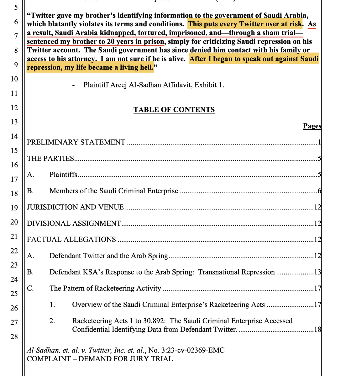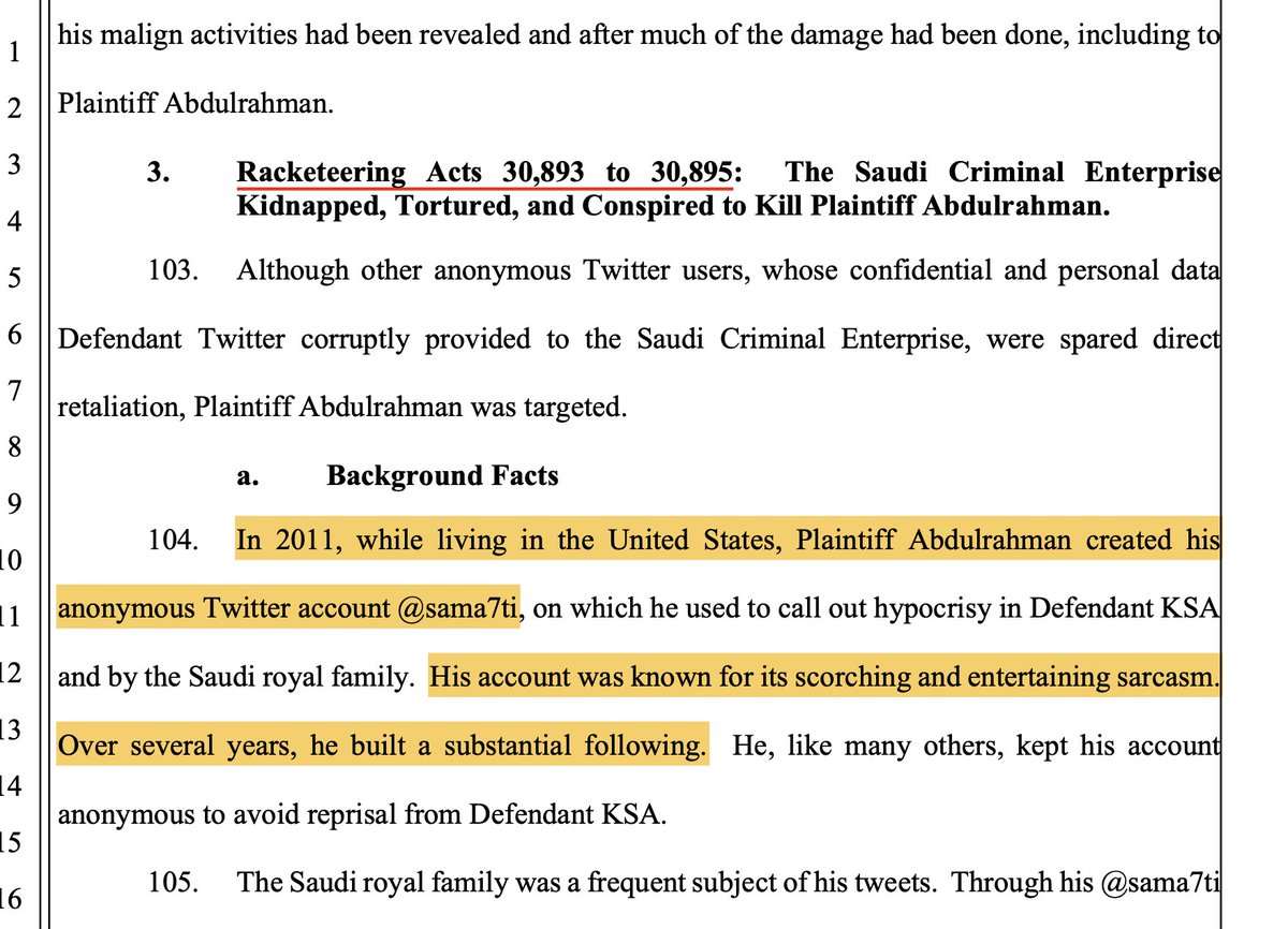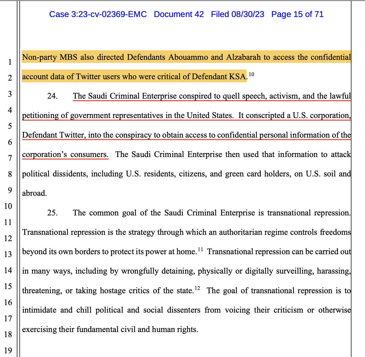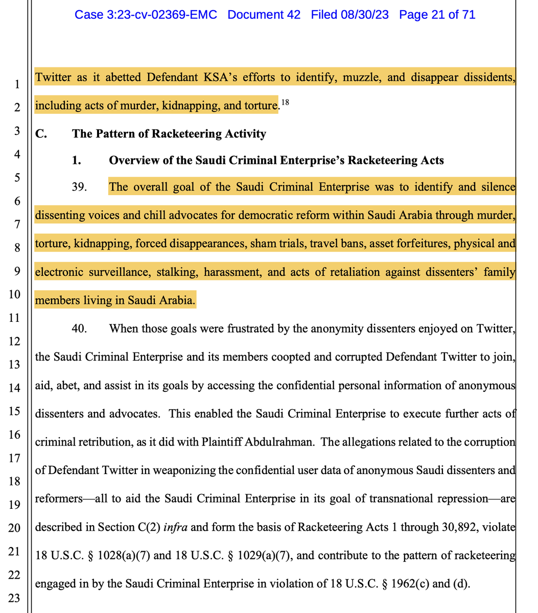 <THREAD> CIVIL SUIT BY TORTURE VICTIM ACCUSES TWITTER OF JOINING RACKETEERING ENTERPRISE WITH SAUDI ARABIA, ENABLING HUMAN RIGHTS VIOLATIONS Let me break down the civil complaint and affidavits. YOU were threatened too by this site's activities. https://www.theguardian.com/world/2023/sep/04/twitter-saudi-arabia-human-rights-abuses?CMP=share_btn_tw