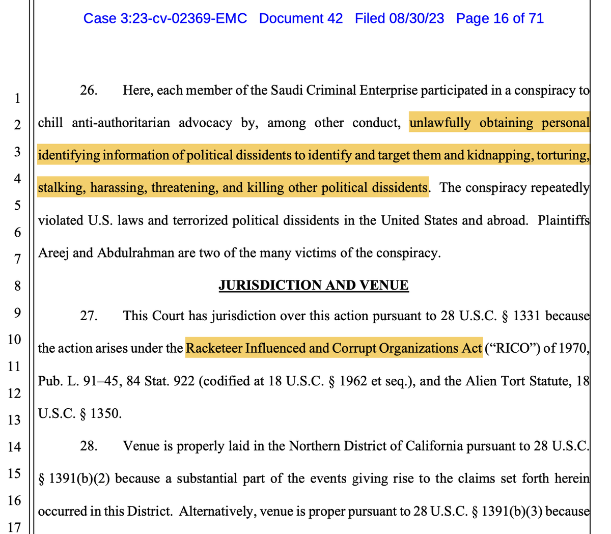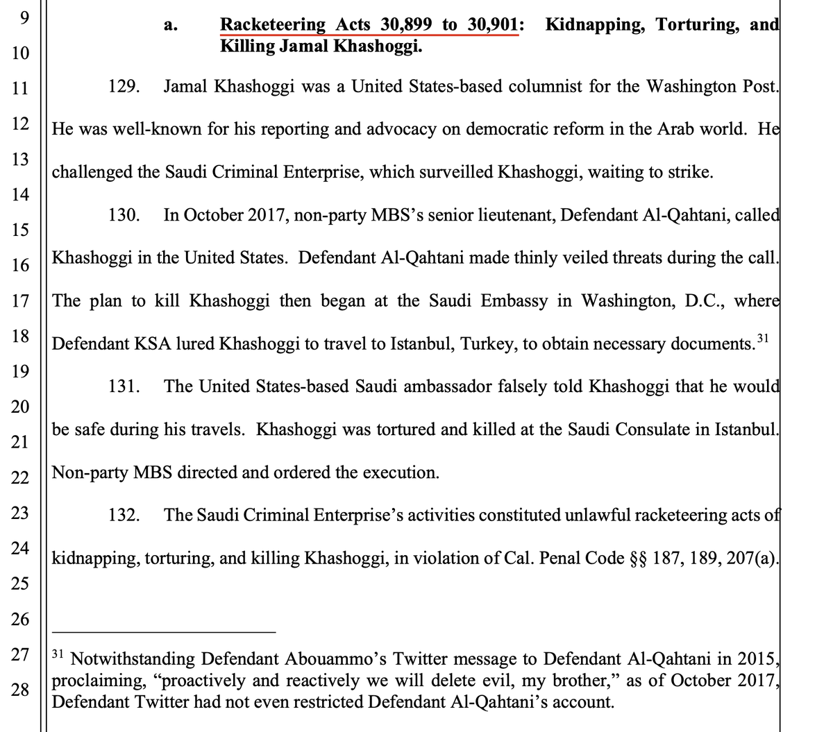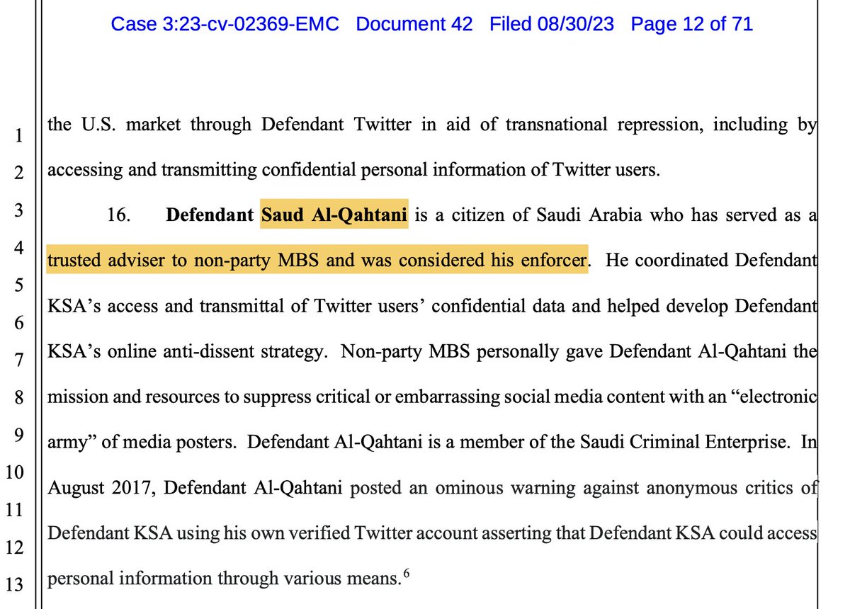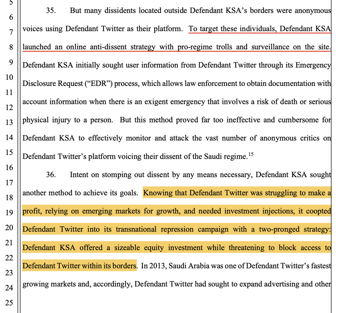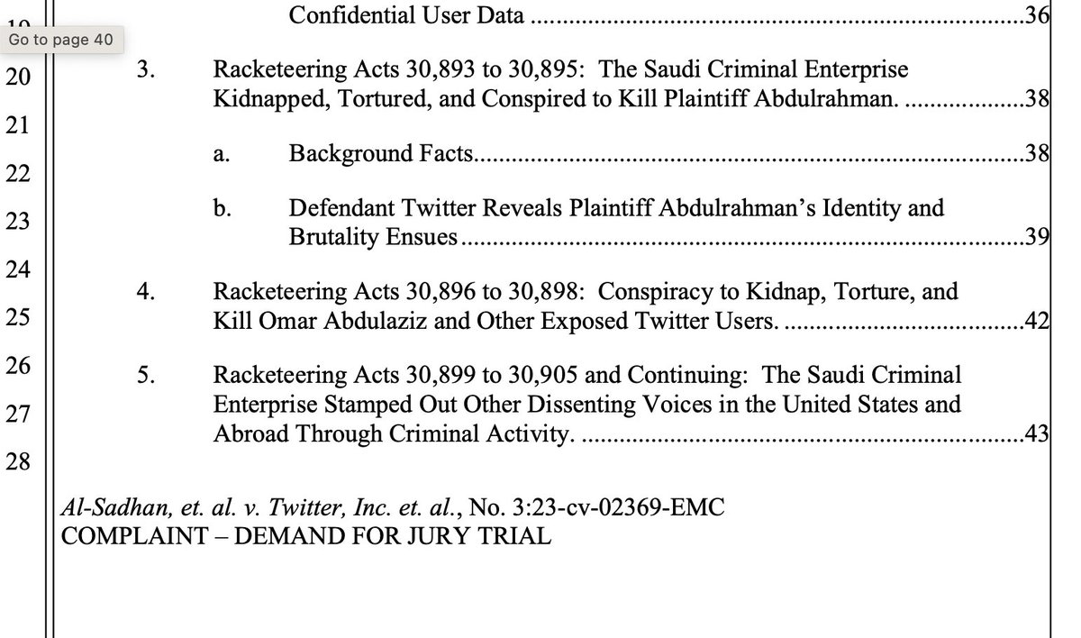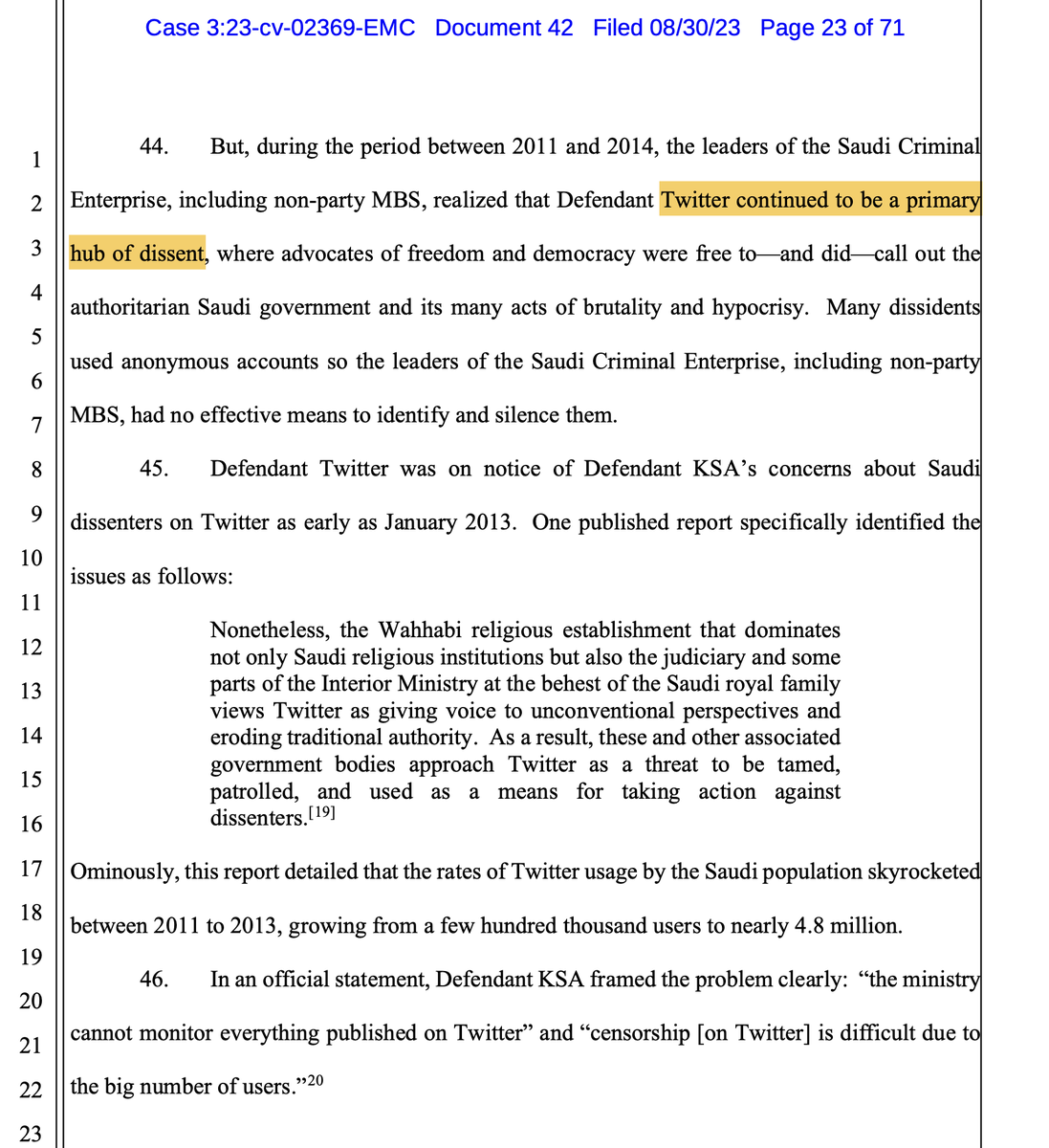 <THREAD> CIVIL SUIT BY TORTURE VICTIM ACCUSES TWITTER OF JOINING RACKETEERING ENTERPRISE WITH SAUDI ARABIA, ENABLING HUMAN RIGHTS VIOLATIONS Let me break down the civil complaint and affidavits. YOU were threatened too by this site's activities. https://www.theguardian.com/world/2023/sep/04/twitter-saudi-arabia-human-rights-abuses?CMP=share_btn_tw