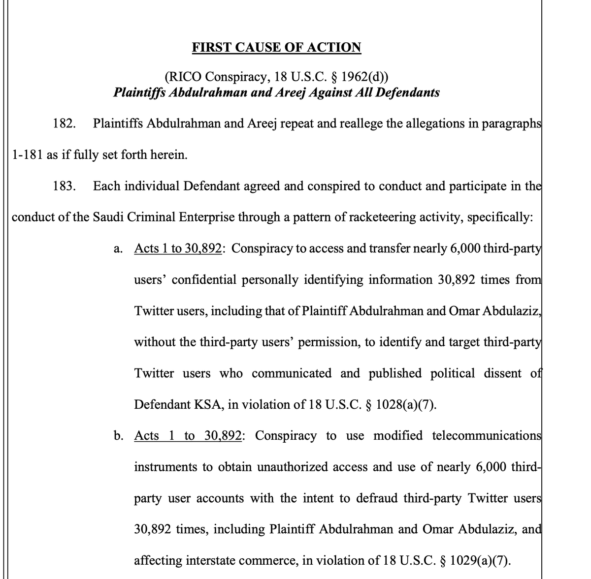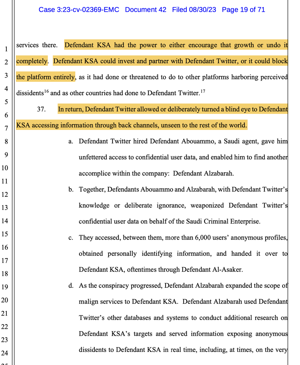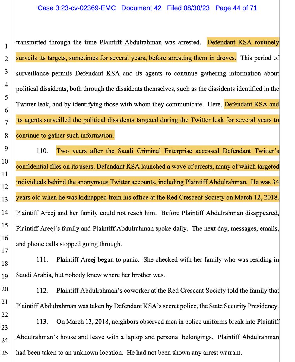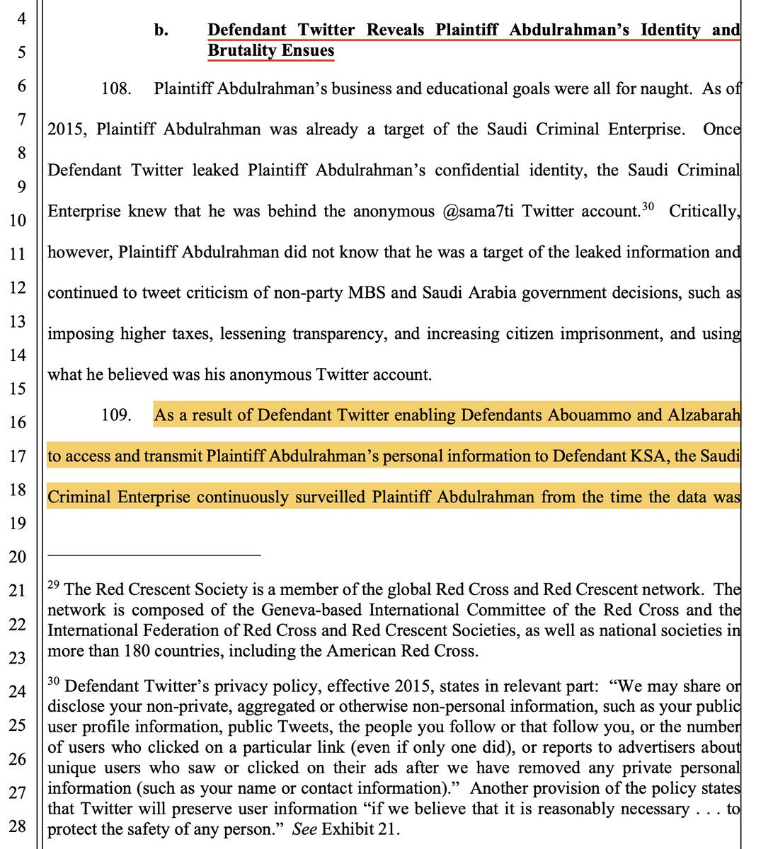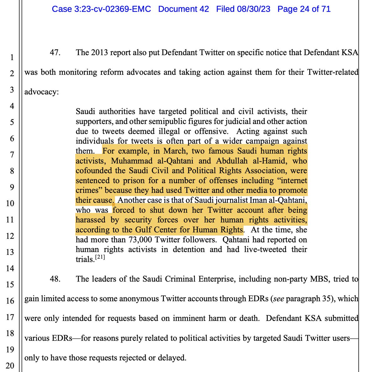 <THREAD> CIVIL SUIT BY TORTURE VICTIM ACCUSES TWITTER OF JOINING RACKETEERING ENTERPRISE WITH SAUDI ARABIA, ENABLING HUMAN RIGHTS VIOLATIONS Let me break down the civil complaint and affidavits. YOU were threatened too by this site's activities. https://www.theguardian.com/world/2023/sep/04/twitter-saudi-arabia-human-rights-abuses?CMP=share_btn_tw