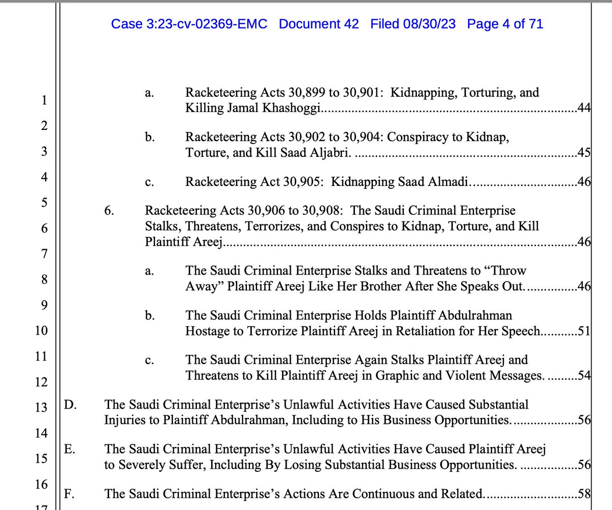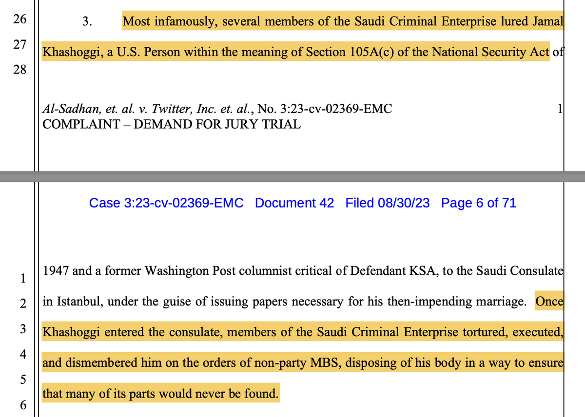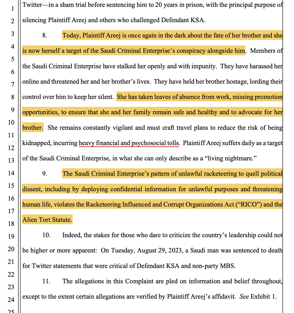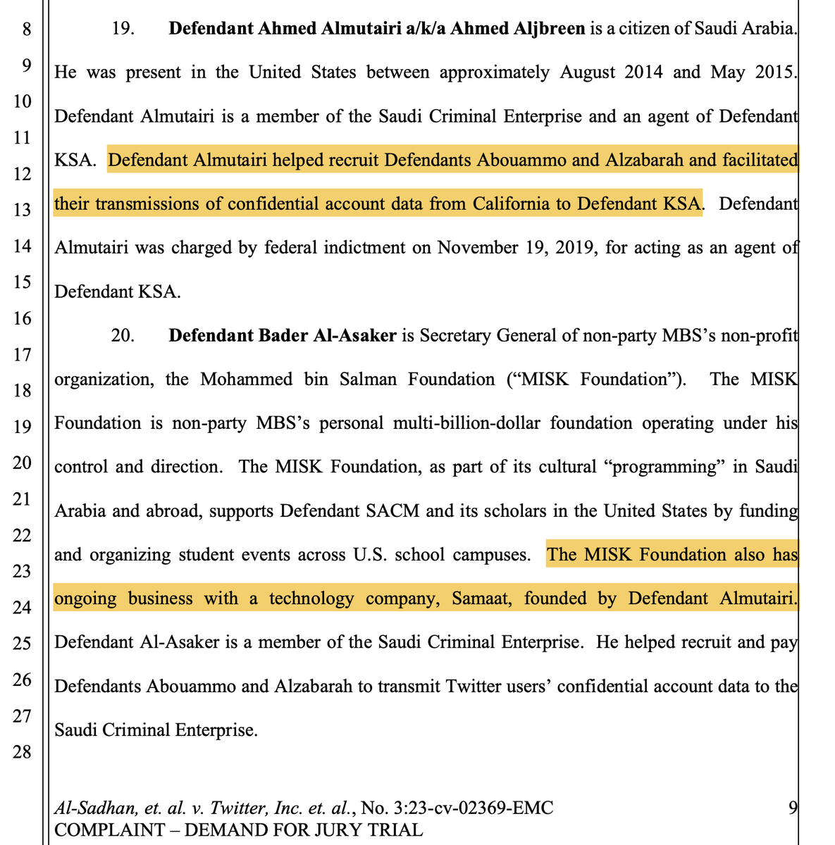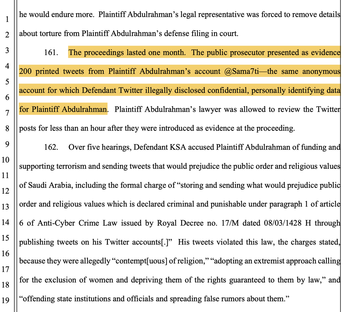 <THREAD> CIVIL SUIT BY TORTURE VICTIM ACCUSES TWITTER OF JOINING RACKETEERING ENTERPRISE WITH SAUDI ARABIA, ENABLING HUMAN RIGHTS VIOLATIONS Let me break down the civil complaint and affidavits. YOU were threatened too by this site's activities. https://www.theguardian.com/world/2023/sep/04/twitter-saudi-arabia-human-rights-abuses?CMP=share_btn_tw
