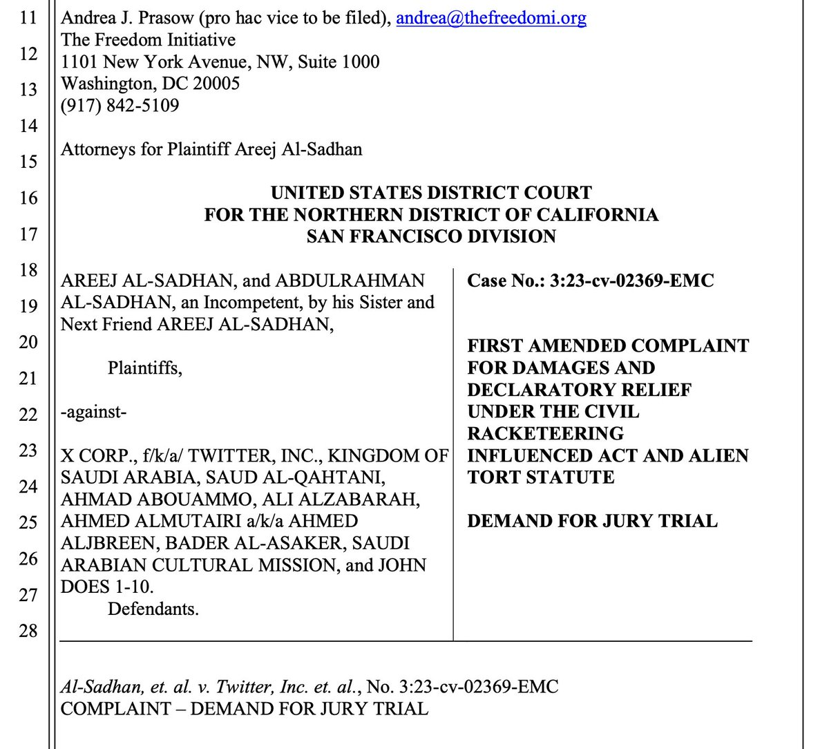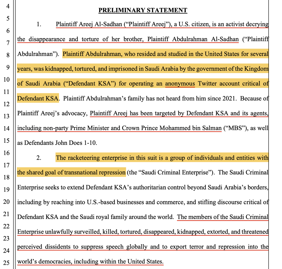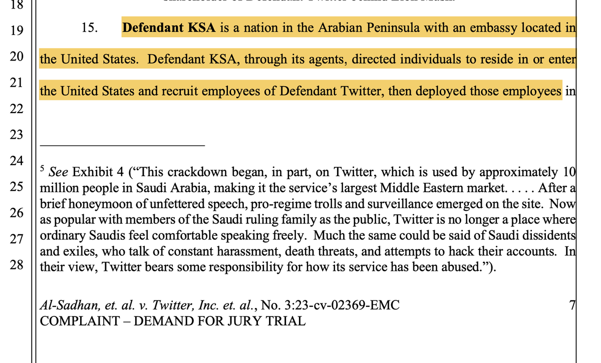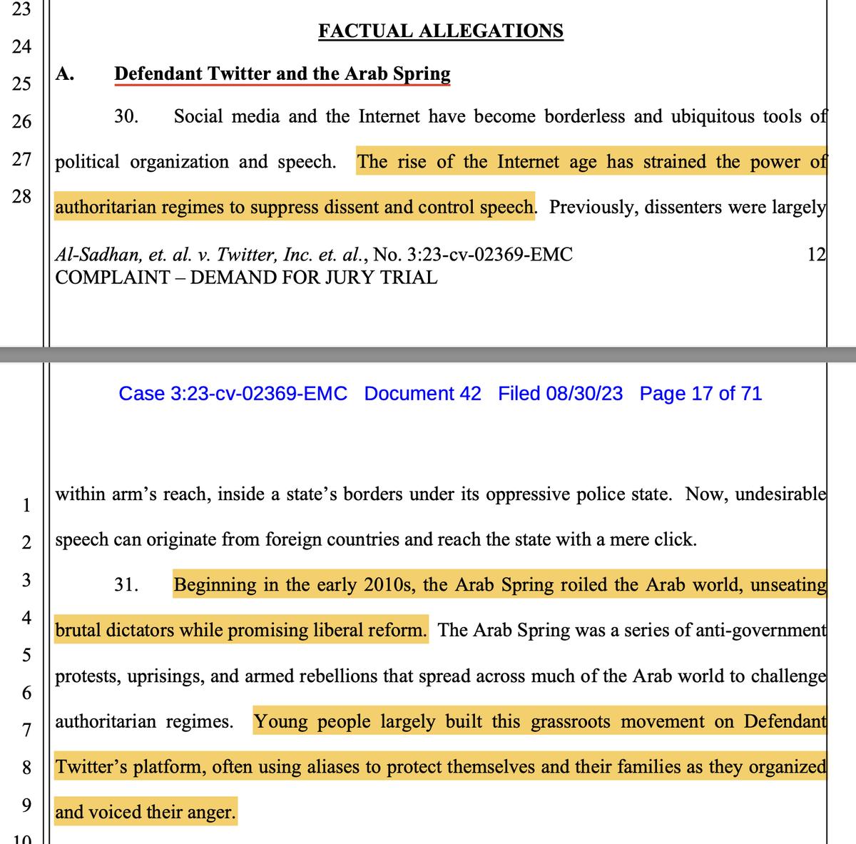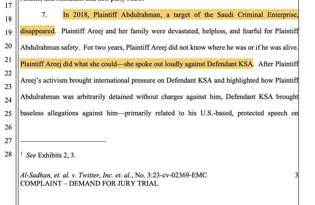 <THREAD> CIVIL SUIT BY TORTURE VICTIM ACCUSES TWITTER OF JOINING RACKETEERING ENTERPRISE WITH SAUDI ARABIA, ENABLING HUMAN RIGHTS VIOLATIONS Let me break down the civil complaint and affidavits. YOU were threatened too by this site's activities. https://www.theguardian.com/world/2023/sep/04/twitter-saudi-arabia-human-rights-abuses?CMP=share_btn_tw