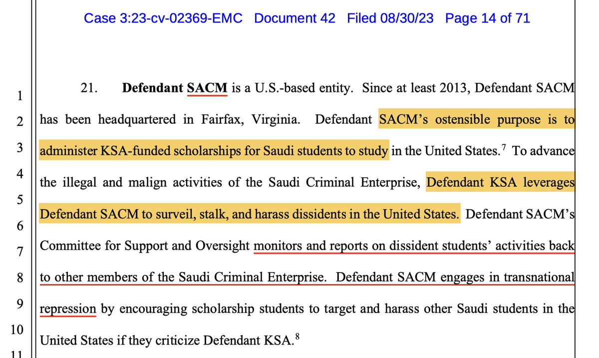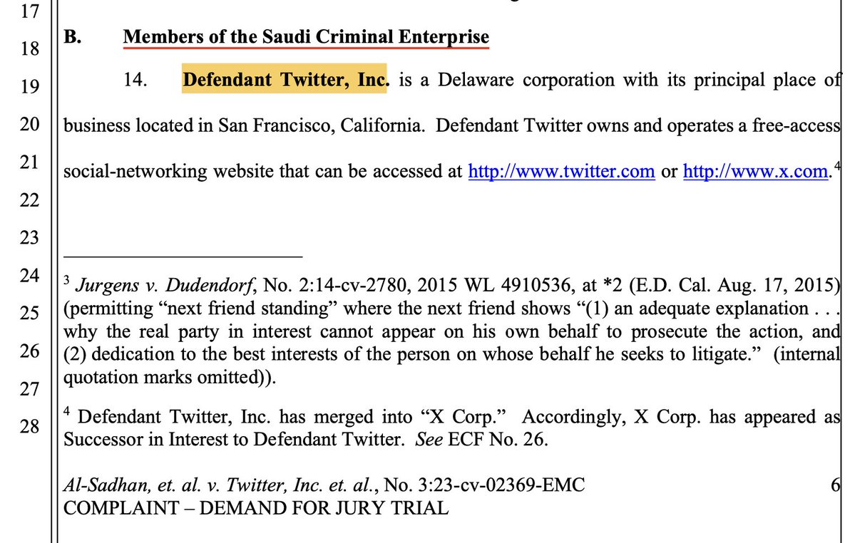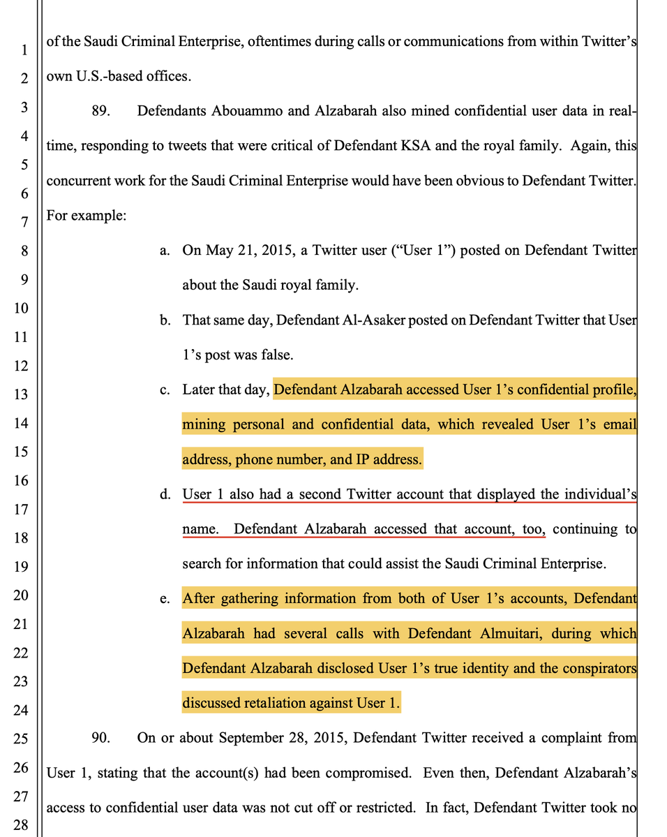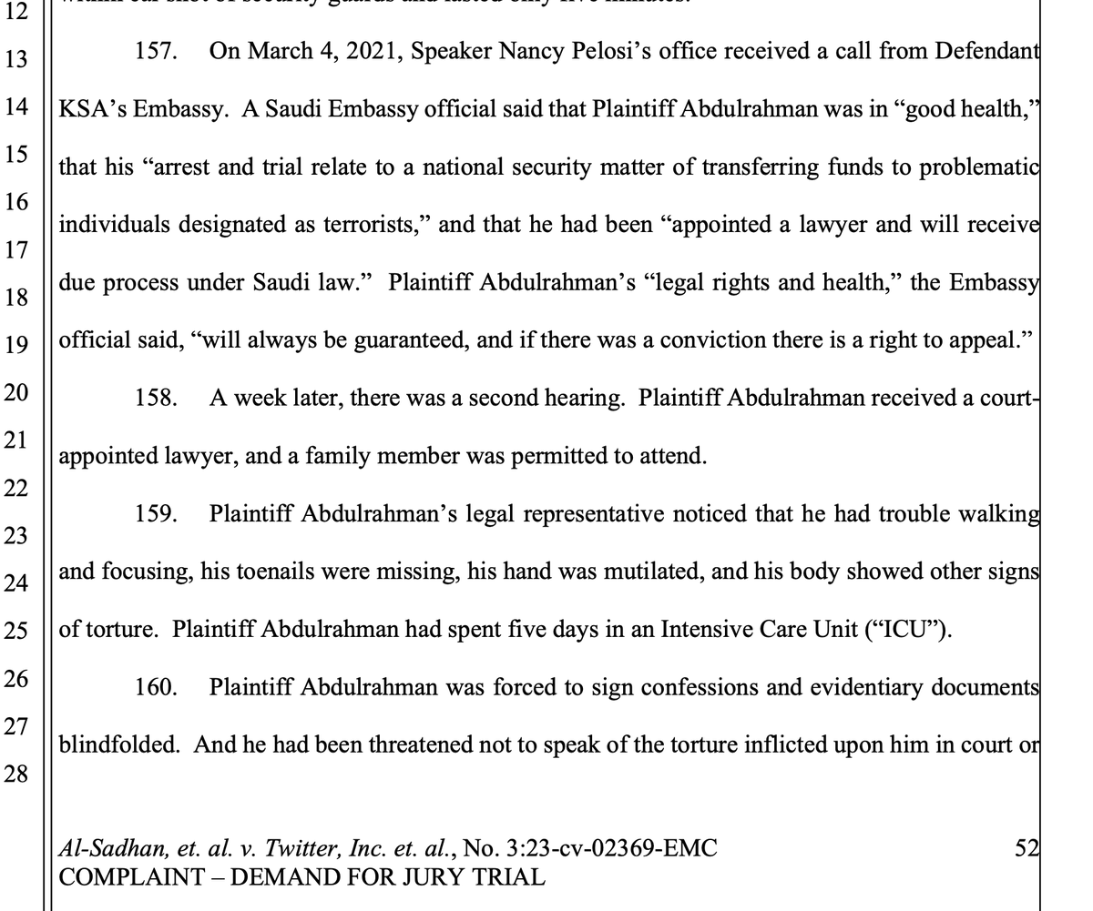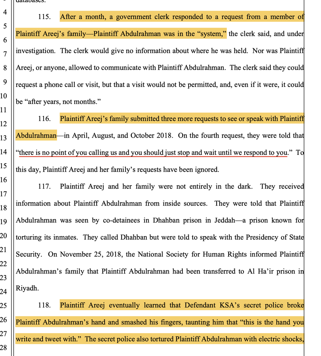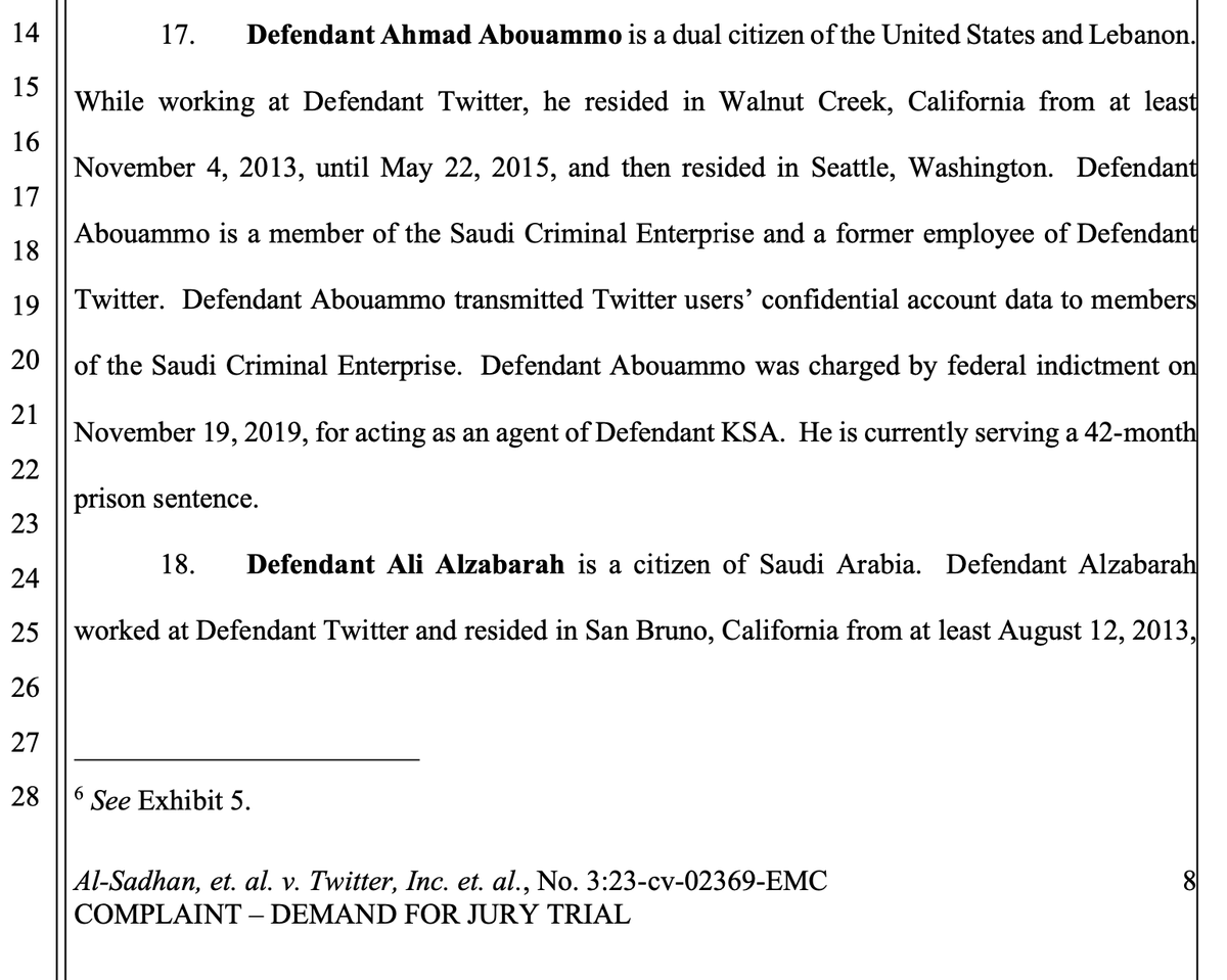 <THREAD> CIVIL SUIT BY TORTURE VICTIM ACCUSES TWITTER OF JOINING RACKETEERING ENTERPRISE WITH SAUDI ARABIA, ENABLING HUMAN RIGHTS VIOLATIONS Let me break down the civil complaint and affidavits. YOU were threatened too by this site's activities. https://www.theguardian.com/world/2023/sep/04/twitter-saudi-arabia-human-rights-abuses?CMP=share_btn_tw