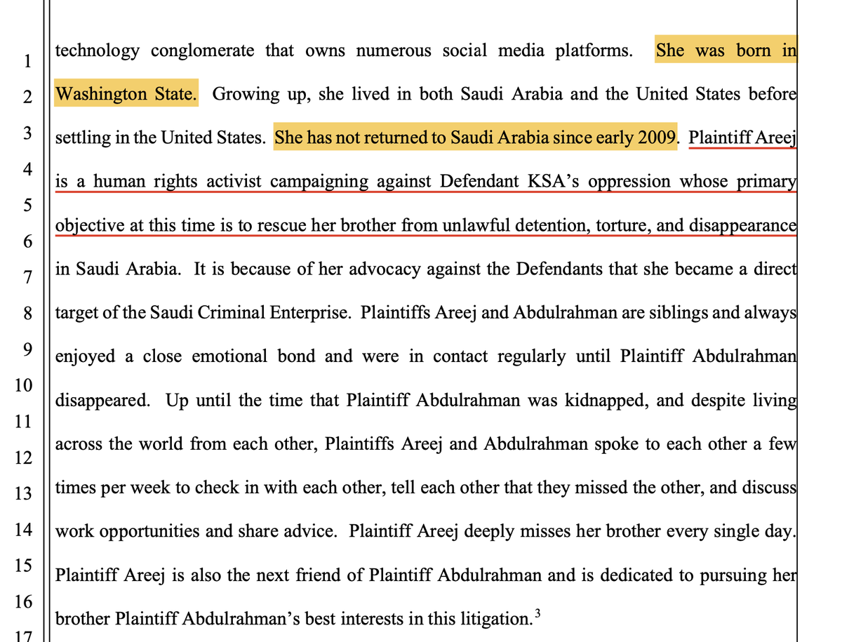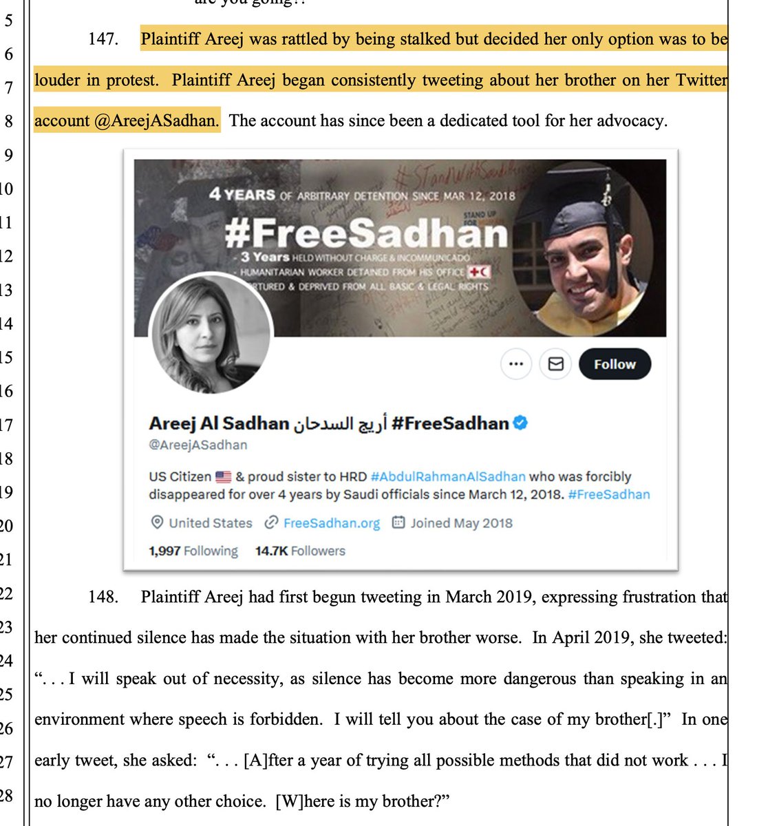 Areej al-Sadhan is the sister of a victim of the Saudis who was targeted through Twitter employees. She too is a victim. She is suing for damages under Civil RICO in the NDCA. https://t.co/NnVei5DHaW