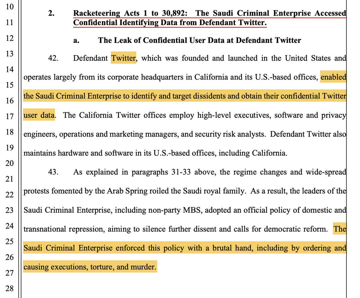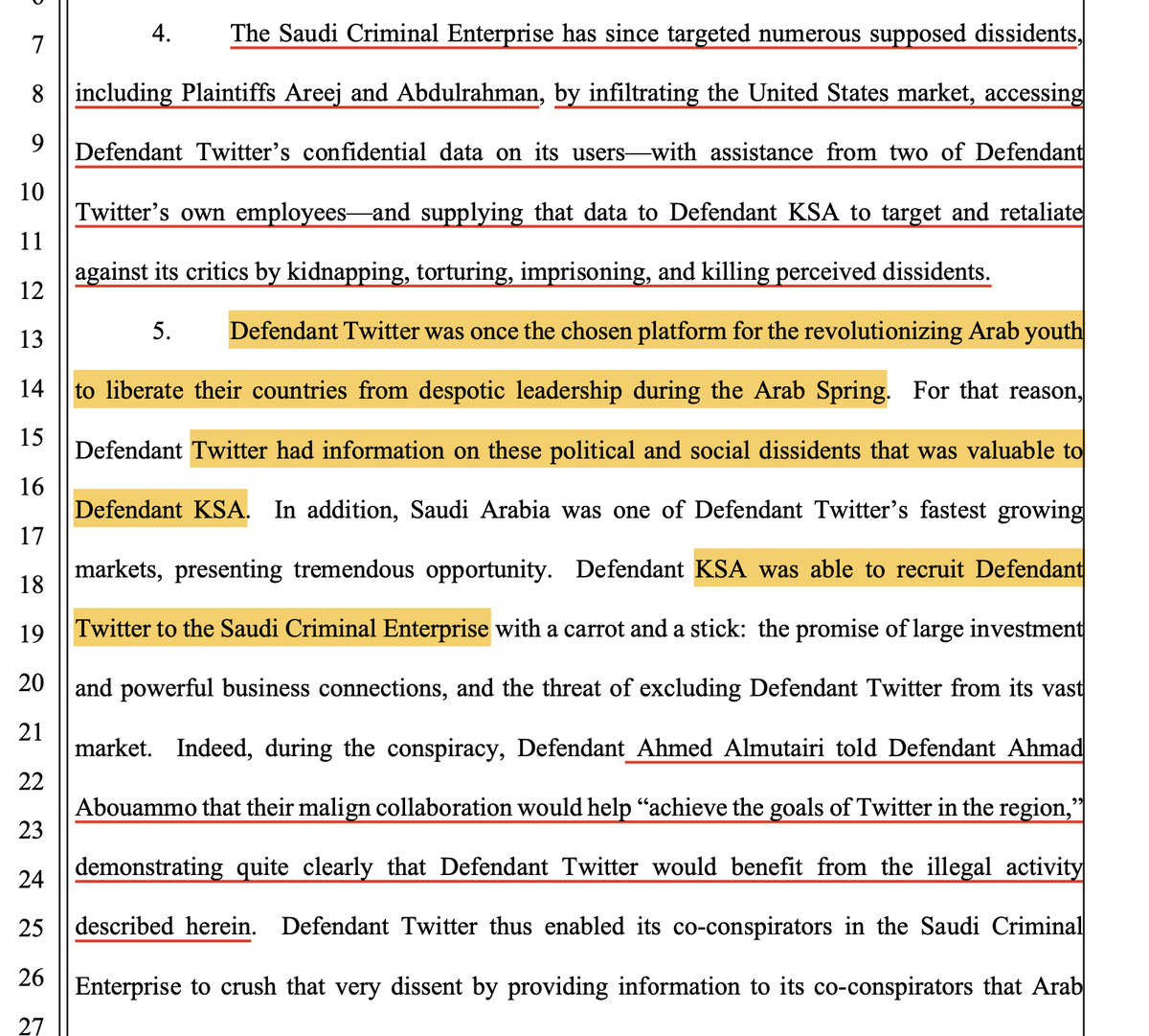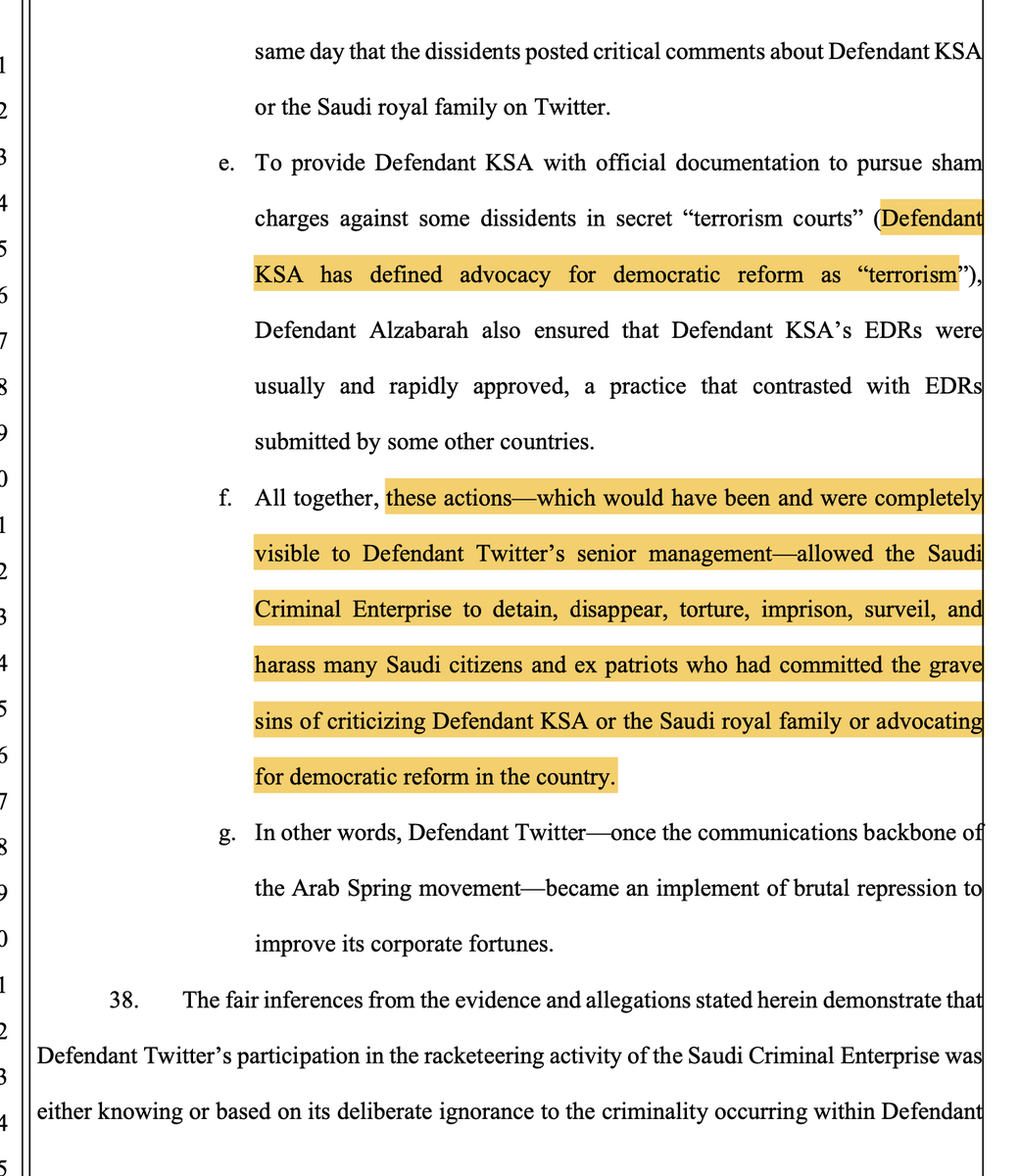 The suit alleges that Twitter was all-in with the Kingdom of Saudi Arabia in a RICO Enterprise that had the goal of repressing criticism of Trump, Putin, Xi, and MBS trying to take over the world and end democracy. Which sounds bad on its face. https://t.co/bDki4BZGki