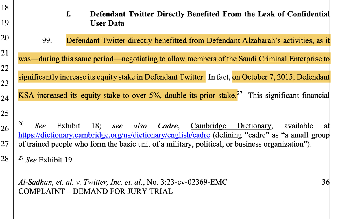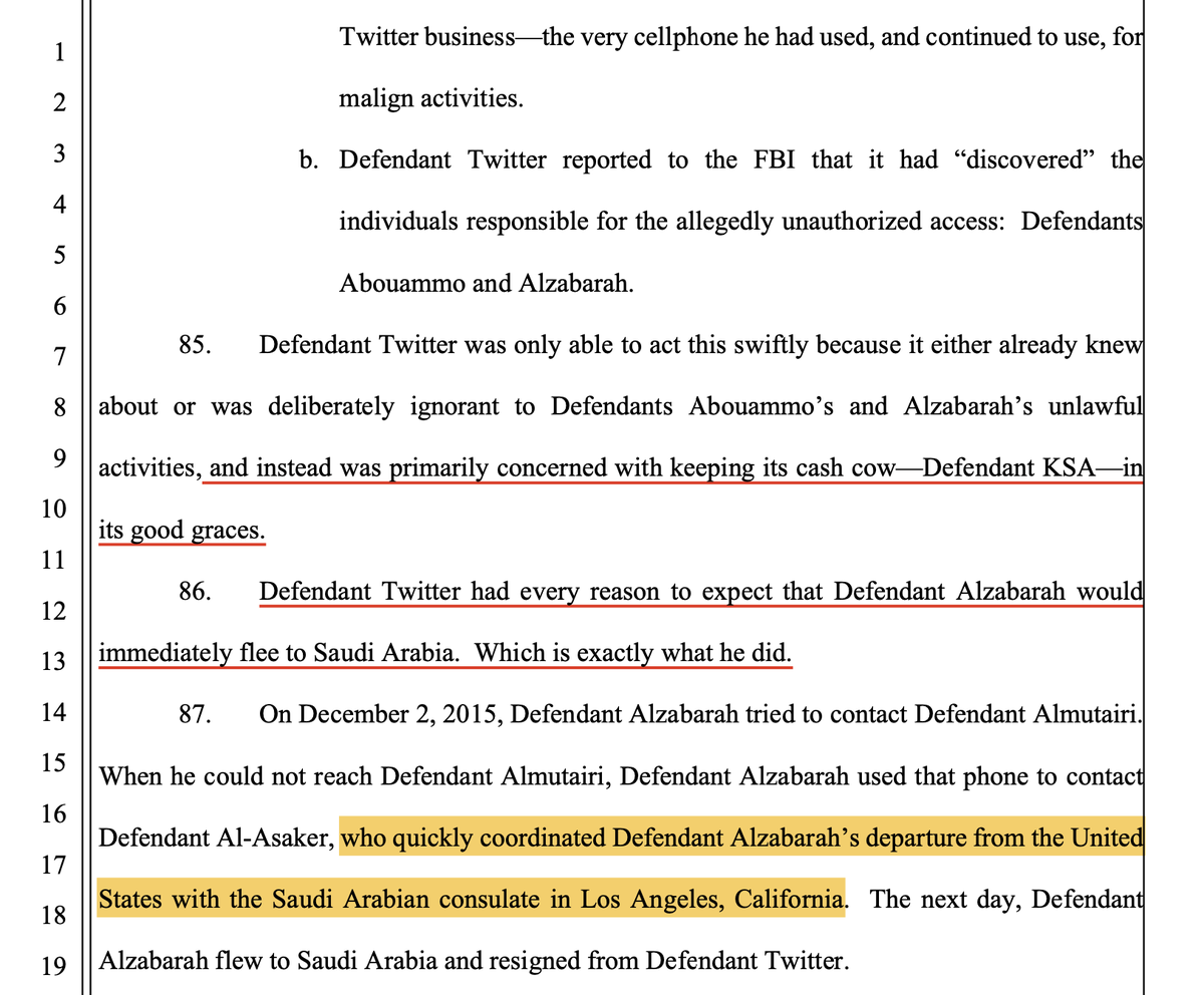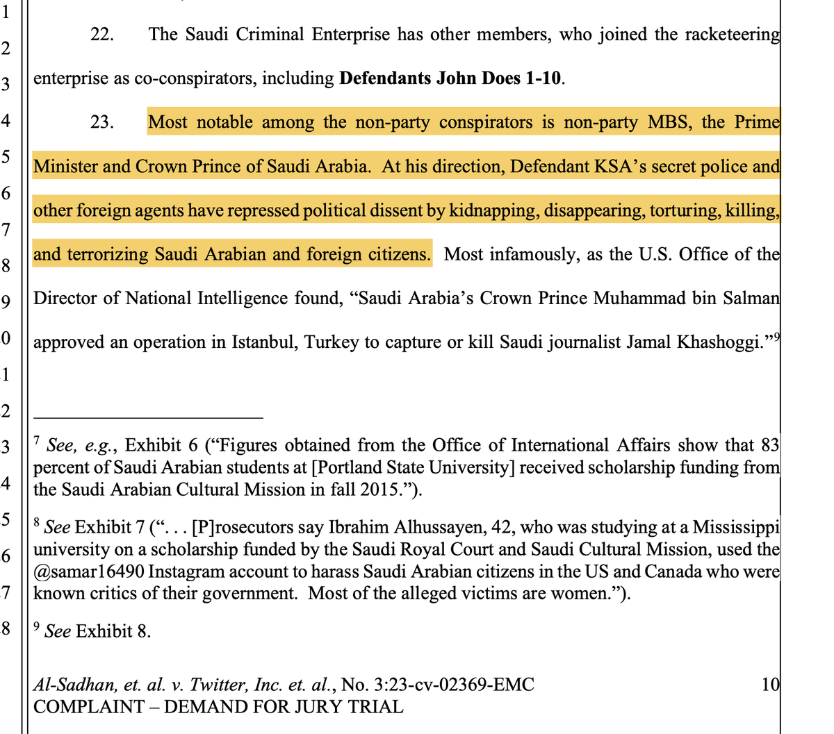 The suit alleges that Twitter was all-in with the Kingdom of Saudi Arabia in a RICO Enterprise that had the goal of repressing criticism of Trump, Putin, Xi, and MBS trying to take over the world and end democracy. Which sounds bad on its face. https://t.co/bDki4BZGki