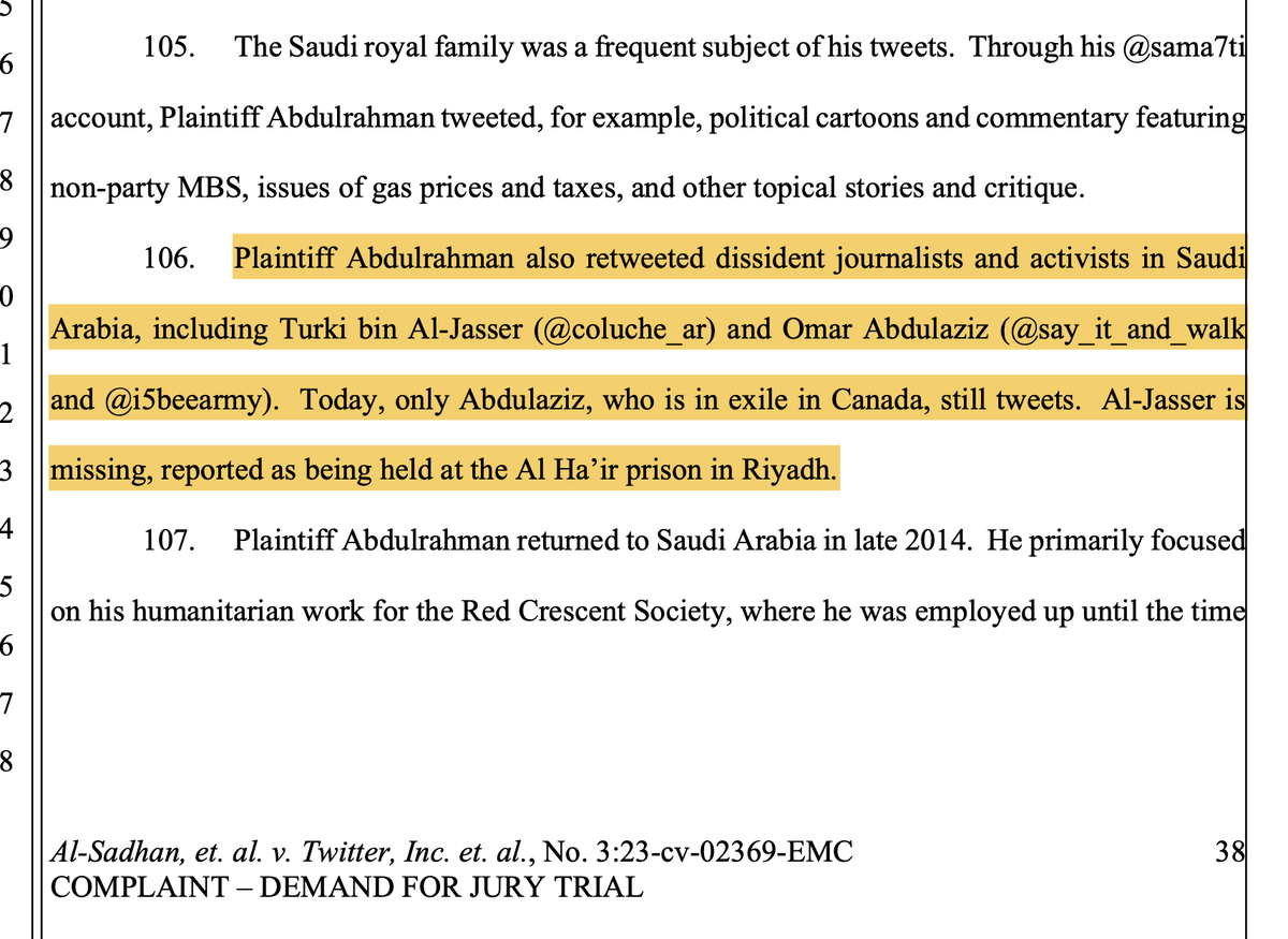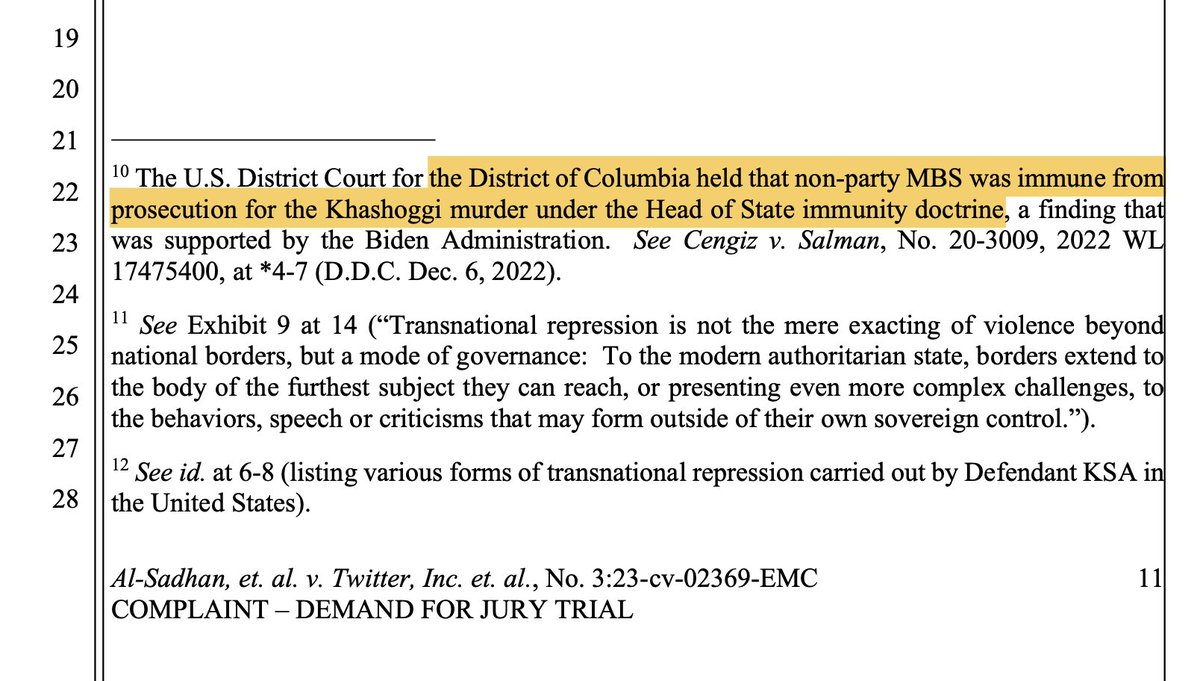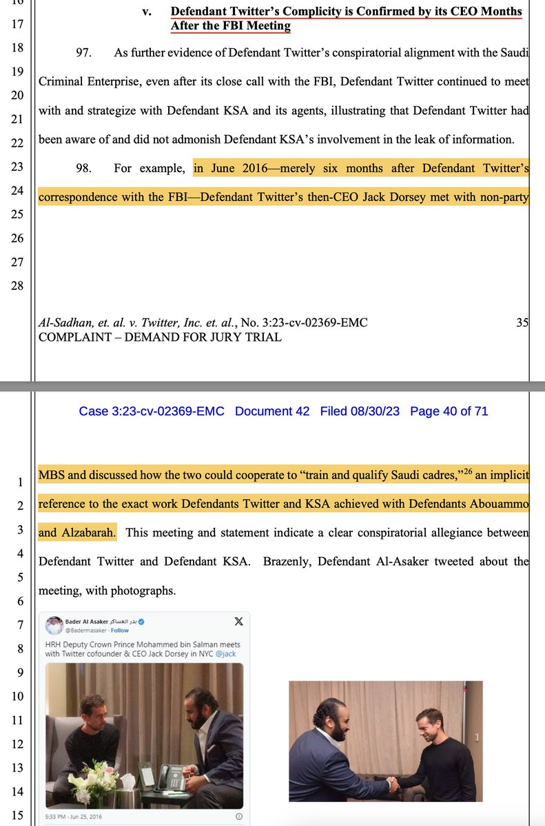 Basically, the suit alleges that Jack Dorsey was in bed with MBS over the torture of democracy activists. https://t.co/hiV0mjIssc