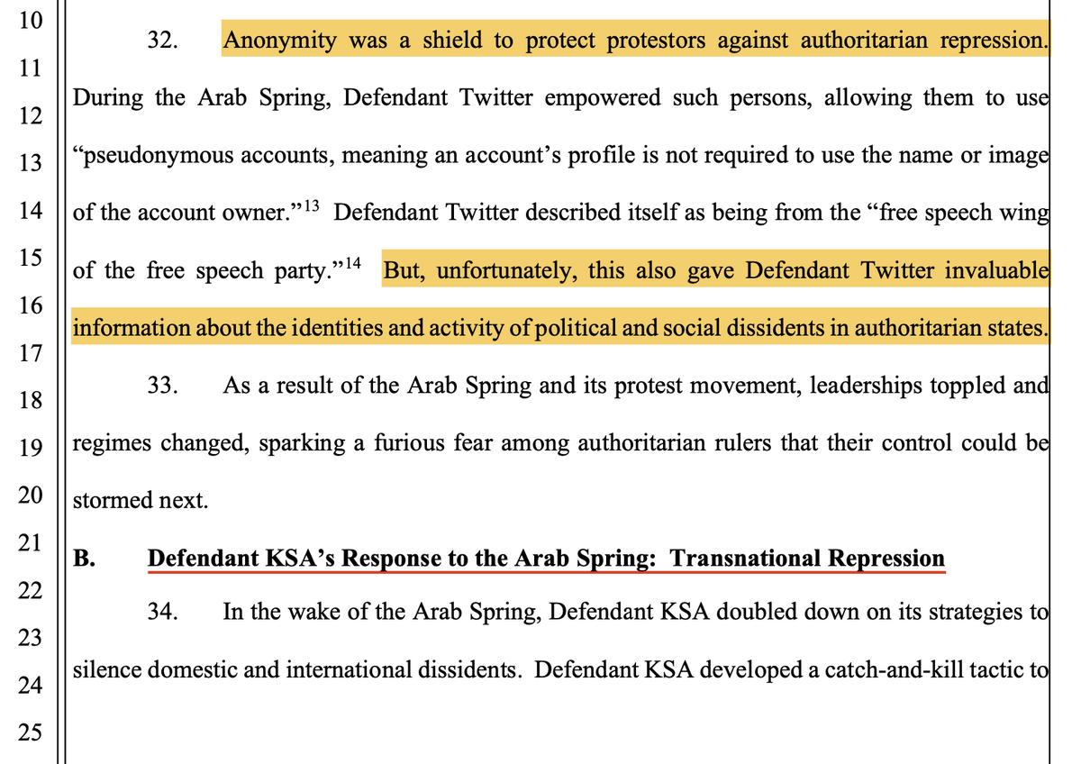 THIS IS WHERE IT GETS INTERESTING - WATCH THIS SPACE The suit alleges that Saudi Arabia aimed to recruit Twitter after the tech company was instrumental in the Arab Spring. KEEP AN EYE ON THIS PART. https://t.co/XW3Pf1GIOz