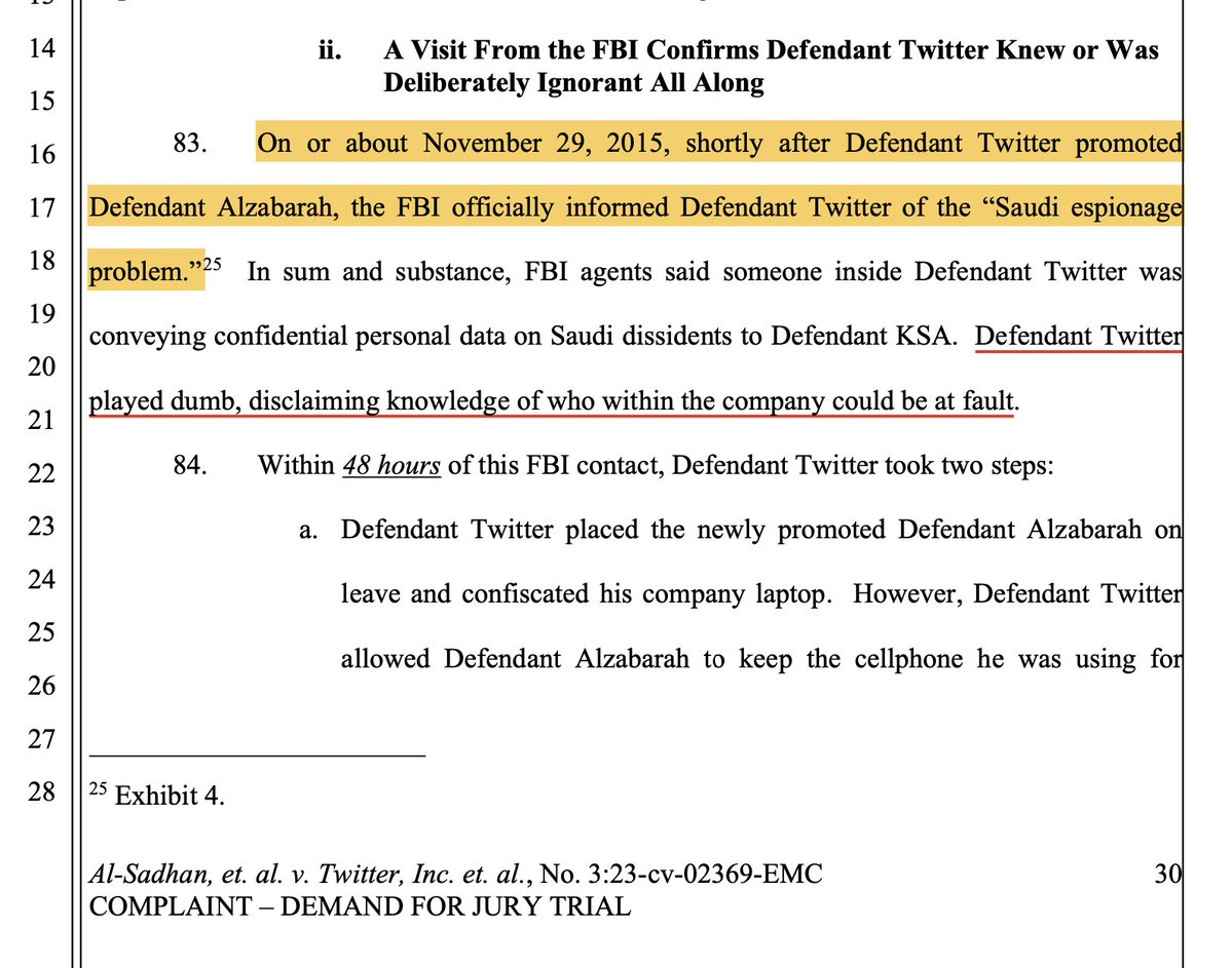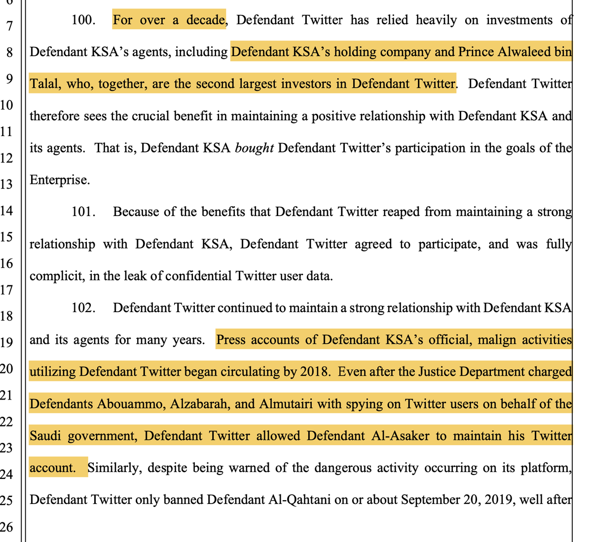 The suit alleges that Twitter gave Saudi an *equity stake of ownership in the company* while targeting democracy. Also, note that the first indictment came under DOJ when Bill Barr ran it. Of course, there was way worse going on. Also: Twitter gave out details on 6000 users. https://t.co/N8Zec9VpDC