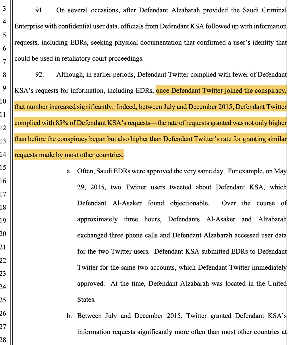 The two KSA spies inside Twitter INFORMED Twitter that the personally identifying information they were gathering was for the Saudi Government. One received money and gifts from the KSA in exchange for the user data including $300K and a nice job after he fled the US. 4/
