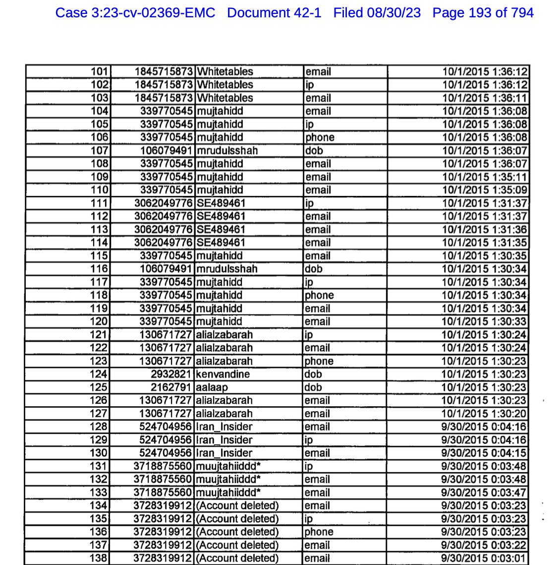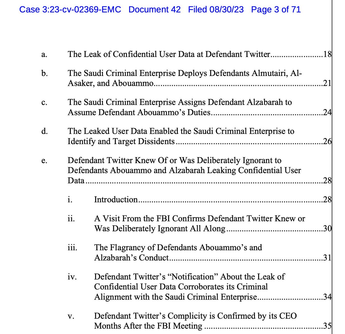 Table of Contents - because the Complaint and Exhibits are 900 pages. Twitter handed user information to a hostile intelligence service. And there's nothing stopping them from doing that to YOU. https://t.co/Z3JQ8k5JM4