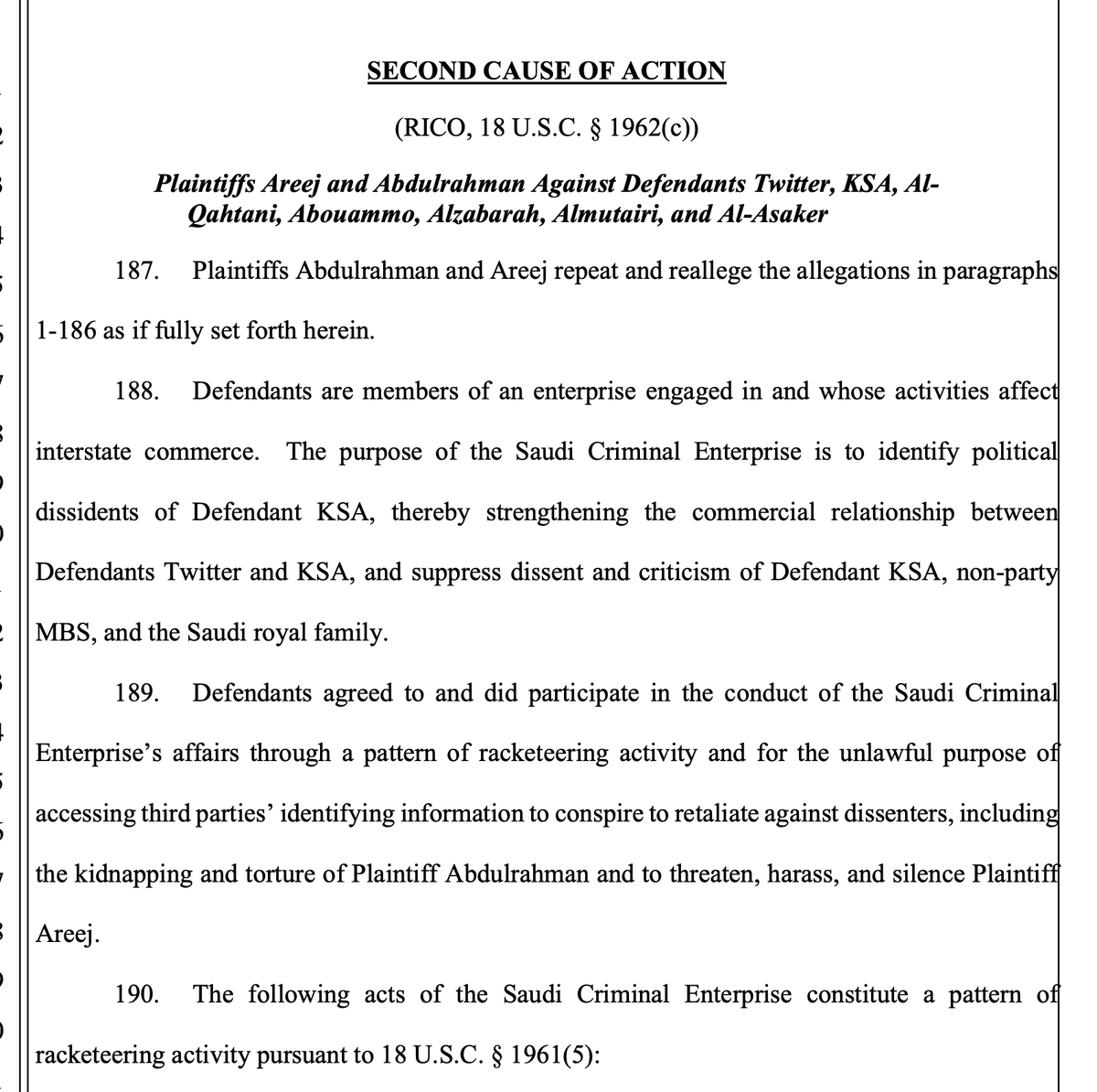Twitter and the Saudis face allegations of engaging in tens of thousands of predicate RICO acts in furtherance of a conspiracy to torture and kill democracy activists who oppose tyranny. Which isn't very nice. https://t.co/ZNC2pzN4zy