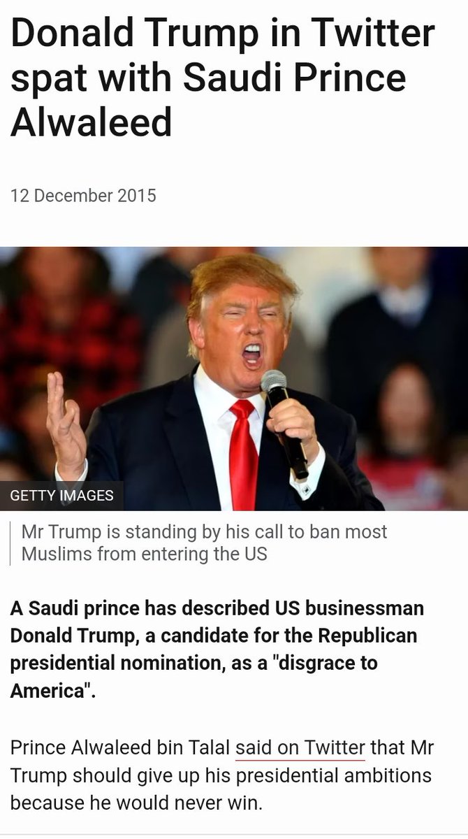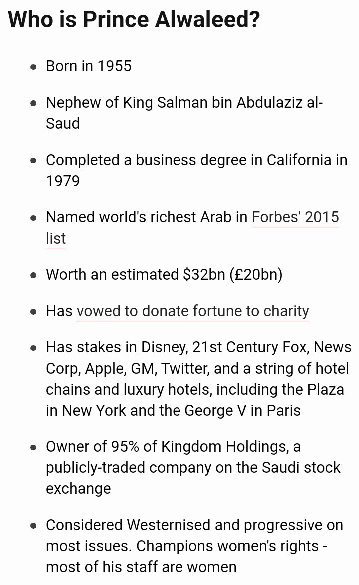 1) Saudi Arabia Timeline: 🧵 Before Trump was President, December 2015, he claimed Saudi Prince Al-Waleed bin Talal Al Saud, “wants to control our politicians with daddy’s money”. Trump called out Al-Waleed just a few months after coming down the escalator, and promised to stop this when he became President. Trump was alleging that certain US politicians were owned by Al-Waleed, who was, and still is, the 2nd largest stakeholder in Twitter, now X, via his investment firm, Kingdom Holding Company. Al-Waleed is an extended member of the Royal House of Saud, not in direct line of the crown, but grandson to King Abdulaziz Al Saud, the founder of modern day Saudi Arabia. On paper, he is worth $16+ billion, but he has (had) access to much more.