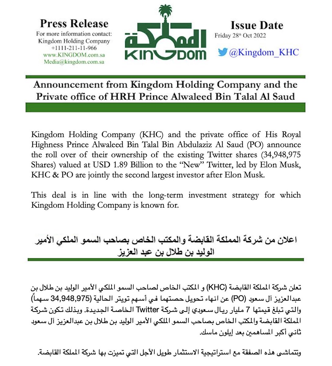 In 2011, they invested $300M. In 2022, MBS bought that investment for $1.5B, worth $1.9B later that year, making KSA (The Kingdom of Saudi Arabia) the biggest shareholder of Twitter behind Elon Musk. 3/