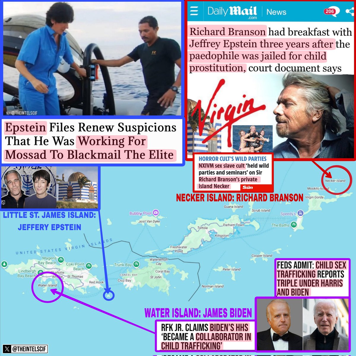EPSTEIN'S ’s CHILD TRAFFICKING operation was so sophisticated that he even had a private submarine and multiple submarine port locations that he used to bring his victims and VIPs to the island with. Ghislane Maxwell was also known to be just as bad as Epstein, and sometimes even worse, and obtained a submarine license and would regularly transport people to the infamous island through an underwater submarine port herself. There is still extremely strong evidence that Epstein was working for Mossad and factions of our own government, especially when the FBI knew of Epstein's operation since 1996 and did absolutely nothing. Prosecutors and other agencies were all told to "back off" because Epstein was part of an intelligence operation. Our own government and others were sex trafficking and abusing children to blackmail world leaders, politicians, celebrities, and other VIPs. You can bet that Diddy is involved in this entire operation as well, targeting more people on the entertainment side for the operation. The U.S. military built a submarine base on St. Thomas Island, which is just 8 miles from Epstein Island, and right next to this military submarine base just happens to be Water Island, owned by Joe Biden's brother, "James Biden," and their "business associates." While Joe Biden was in office in 2020, child sex trafficking increased by 300%. Recently, the Trump administration confirmed that the Biden/Harris administration and Biden's own HHS were, in fact, involved and collaborating in the trafficking of children. Yes, you read that correctly. Now read that again. Our own government was trafficking children. Finally, there's Richard Branson, owner and CEO of Virgin and Necker Island, which is just a short boat ride from Epstein or James Biden's Island located on the British side of the Virgin Islands. There's no coincidence that Branson picked "Virgin" as his company name. He also was confirmed to frequently see Epstein well after he was charged and convicted the first time for crimes against a minor. Branson also was said to be involved and held parties on his island for the sex trafficking cult called "NXIVM," which I recently just did a video on that you can find in my timeline. Are you beginning to understand the full scope of this child trafficking operation? Are you seeing their methods and players? How DOGE has been uncovering their money machines and laundering operations through front companies, NGOs, USAID, and other programs involving our tax dollars? Do you see why arrests are taking so long? This is the largest, most important case in the world. Blackmail runs the world, and that is done with the sexual abuse of children. This is why child sex trafficking is so important, not only to literally save the world, but to save the children. Everything is connected. There are no coincidences.