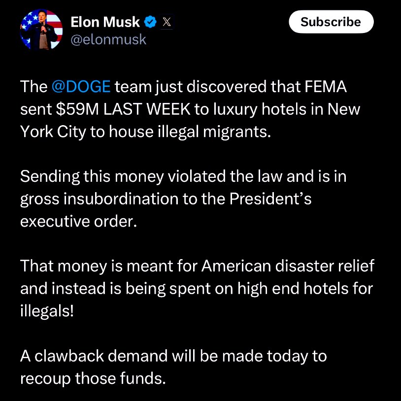 The @DOGE team just discovered that FEMA sent $59M LAST WEEK to luxury hotels in New York City to house illegal migrants. Sending this money violated the law and is in gross insubordination to the President’s executive order. That money is meant for American disaster relief and instead is being spent on high end hotels for illegals! A clawback demand will be made today to recoup those funds.