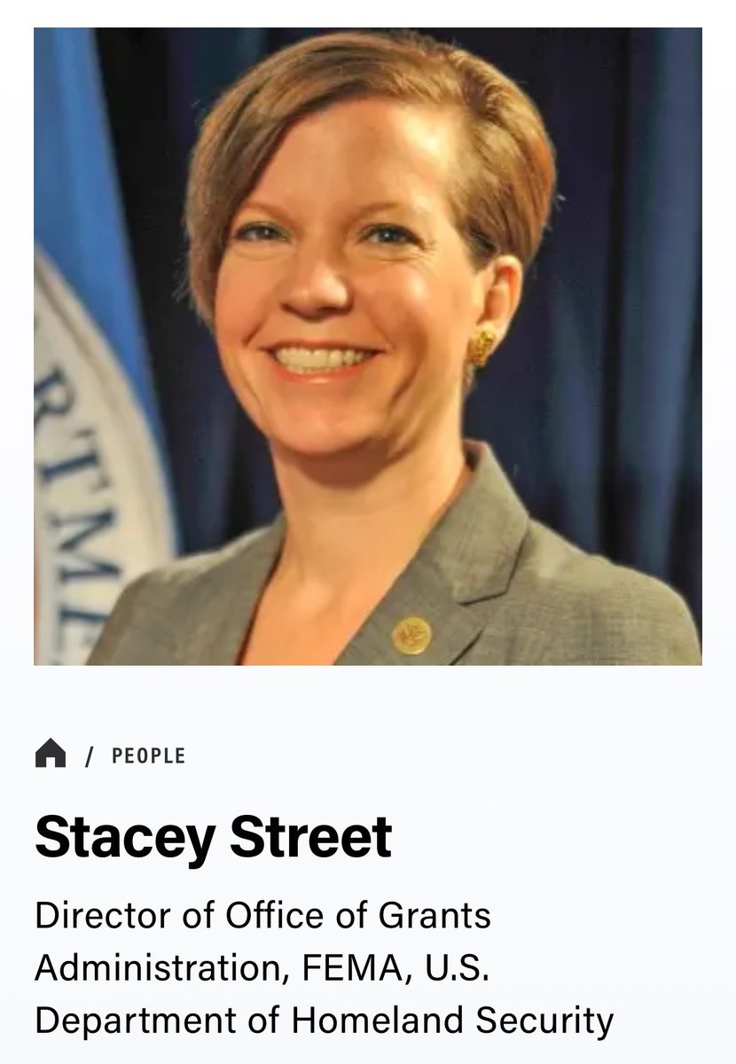 This is Stacey Street, Director of Grants Administration at FEMA’s Grant Programs Directorate. Street is responsible for approving and disbursing funds for 96 grant programs, including the Shelter and Services Program for noncitizen migrants. She was the one who defied President Trump’s executive order and allocated $59 million to house illegal immigrants in luxury hotels in New York City.