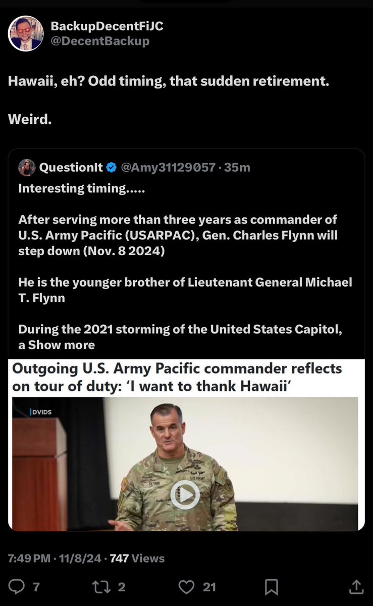 Lt. Gen. Michael T. Flynn served as the 25th National Security Advisor to the 45th President of the United States. A retired three-star general with thirty-three years of military service, Flynn currently serves as Chairman of America's Future Inc., a 501(c)(3) nonprofit organization. His presence on X, where he posts under the handle @GenFlynn, reaches an audience measured in the millions across fourteen confirmed platforms including Truth Social, Telegram, Substack, and Rumble.