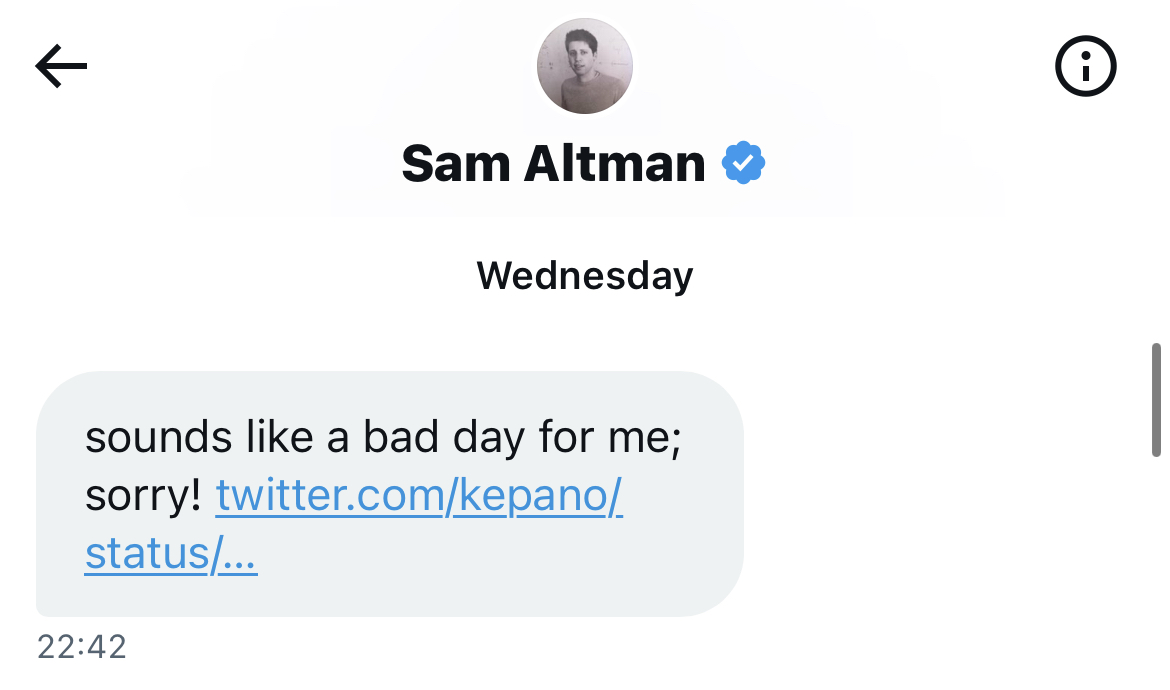 Sam DMd me to apologize. I like to give the benefit of the doubt so I deleted my tweet It has not changed my view that @sama's vision is to diminish the freedom of individuals and put more power in the hands of fewer people OpenAI and Worldcoin are on the wrong side of history.