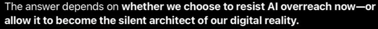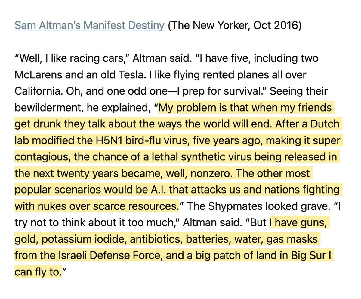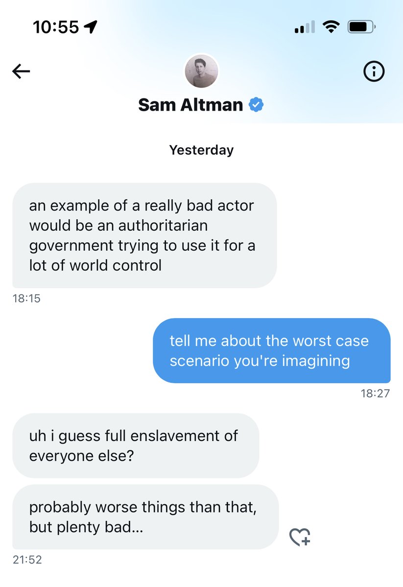 Sam Altman's perspective is that AI could destroy us all, therefore he must be the first create it and control it, so that he can ensure that nothing bad happens to him and his friends. Sam is building a cohesively anti-humanistic top-down system of control because he is afraid.