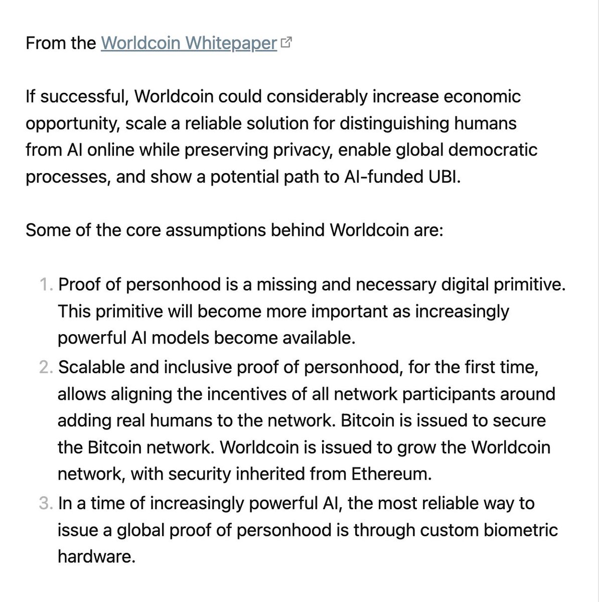 Worldcoin is explicitly tied to Sam Altman's prophecy for AI. If AI displaces the majority of jobs, then people will need another way to receive income. What better solution to distribute that money than one that Sam controls?