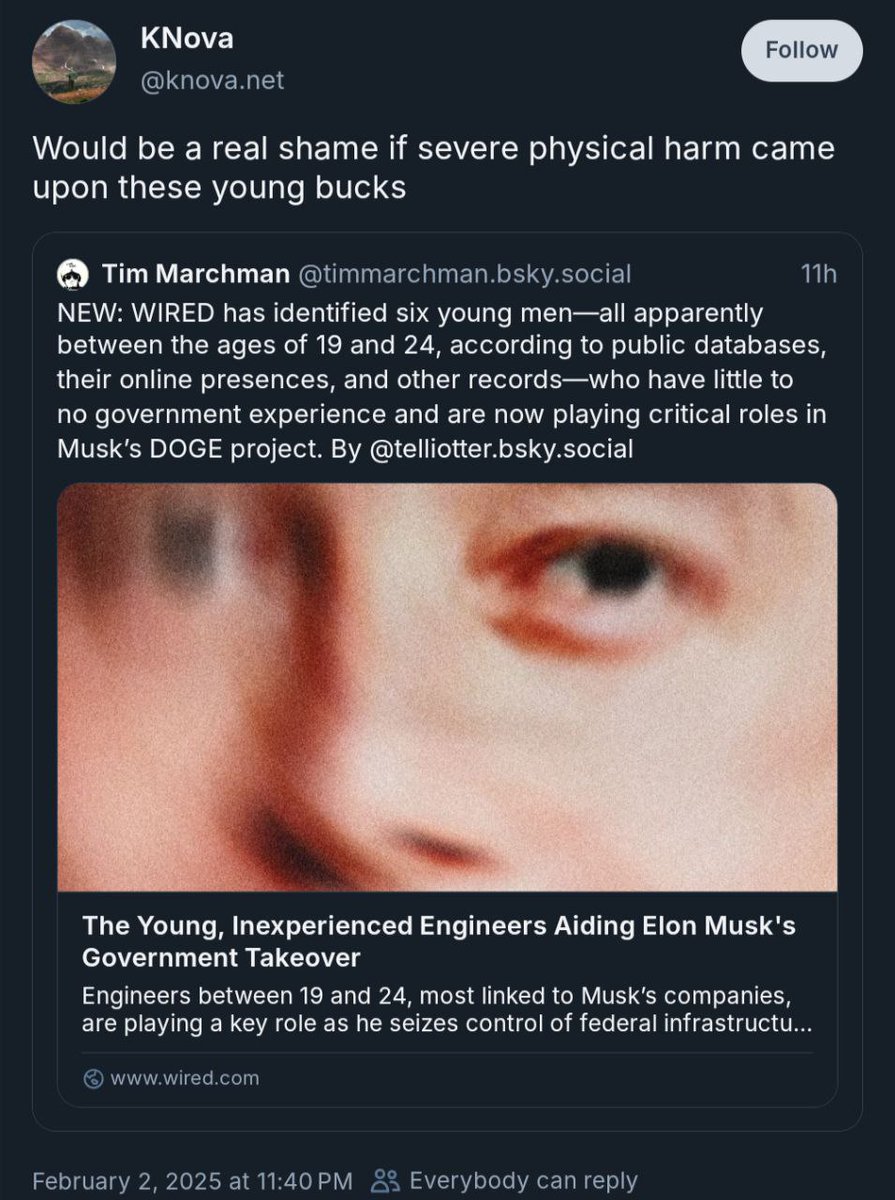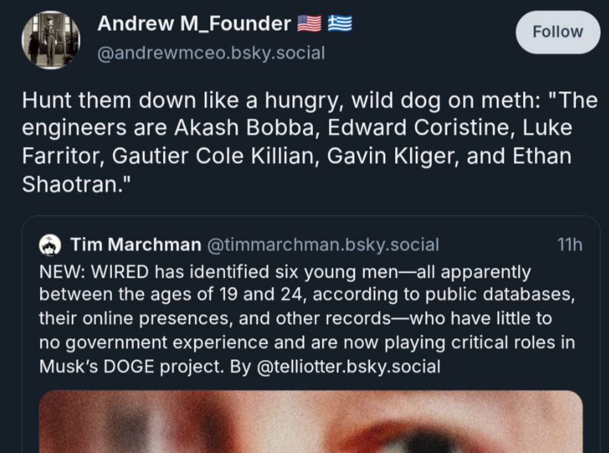 "Hunt them down" Leftists on @bluesky and other social media sites are mobilizing threats of violence against the @DOGE team staff and their families as revenge against @elonmusk and the Trump administration. https://t.co/m8ujSOv3Xa