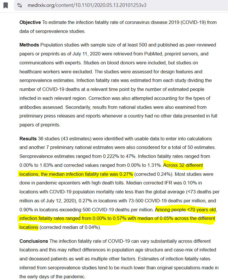 Item 1 - Prof John Ioannidis estimates of the Infection Fatality Rate of COVID. John Ioannidis, world-leading epidemiologist from Stanford (or he was at that time, his name was soon dragged through the mud), used seroprevalence data (indicating how many people had been exposed to SARS-COV-2) from studies around the world (32 different locations) to estimate the infection fatality rate of COVID-19 (how many people will die on average in a group of people infected with the virus). He concluded that the median infection fatality rate was 0.27% and that for people under 70, the median was 0.05% (1 in 2,000), showing that the virus was overwhelmingly a risk only to the elderly and even then, little more of a risk than seasonal influenza. (As a comparison, the IFR of seasonal influenza is about 1 in 1,000 (0.1%) across all age groups). These rates (from the real world) were far lower than those used in Imperial College modelling and quoted in the media by politicians. An early indication that the whole thing was being overblown. And these estimates were produced very early on in the "pandemic" before the virus had mutated to become even less deadly. Ioannidis study: https://www.medrxiv.org/content/10.1101/2020.05.13.20101253v3 2/10