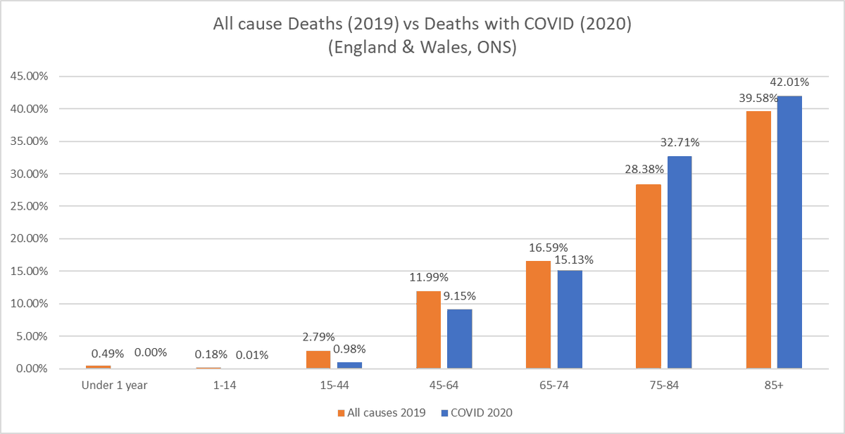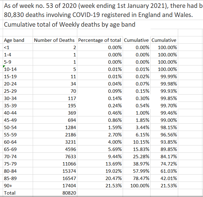 Item 3 - ONS data from Freedom of Information requests ONS data gradually became more and more politicised during the coronapanic, and therefore less and less useful, but the data it gave in response to FOI requests in 2020 was actually quite useful. For example this analysis of the age breakdown of those who died following a positive COVID test in 2020 in England and Wales. It showed once again the extent to which this virus was primarily a threat to the very elderly, with 84% of victims over the age of 70 (and also, only 9 victims under the age of 15). Again, consistent with the earlier Ioannidis analysis. Other FOI requests revealed that the mean age of those who died with COVID was over 80, and that, of the 80,000+ deaths recorded "with COVID" in 2020, only 9,000 listed COVID as the sole cause of death on the death certificate - the overwhelming majority of deaths involved at least one other comorbidity. This data also made it possible to compare the age distribution of deaths with COVID in 2020, with deaths from all causes in 2019, and this analysis revealed that if you were under the age of 75, you were more likely to die of any cause, than with COVID. So these three analyses showed that, from an early date, it was clear that SARS-COV-2 was not the deadly threat to everyone it was portrayed to be. ONS FOI links: https://www.ons.gov.uk/aboutus/transparencyandgovernance/freedomofinformationfoi/deathsfromcovid19byageband https://www.ons.gov.uk/aboutus/transparencyandgovernance/freedomofinformationfoi/averageageofthosewhohaddiedwithcovid19 https://www.ons.gov.uk/aboutus/transparencyandgovernance/freedomofinformationfoi/deathsfromcovid19withnootherunderlyingcauses 4/10